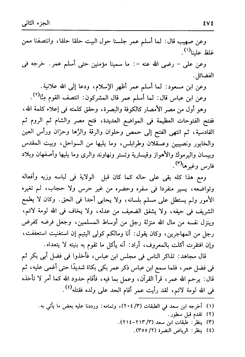 وَعَن صُهَيْب قَالَ لما أسلم عمر جلسنا حول الْبَيْت حلقا حلقا وانتصفنا مِمَّن غلظ علينا وَعَن عَليّ رَضِي الله عَنهُ مَا سمينا مُؤمنين حَتَّى أسلم عمر خرجه فِي الْفَضَائِل وَعَن ابْن مَسْعُود لما أسلم عمر أظهر الْإِسْلَام ودعا إِلَى الله عَلَانيَة وَعَن ابْن عَبَّاس قَالَ لما أسلم عمر قَالَ الْمُشْركُونَ انتصف الْقَوْم مِنا وَهُوَ أول من مصر الْأَمْصَار كالكوفة وَالْبَصْرَة وحقق كَلمته فِي إعلاء كلمة الله فَفتح الفتوحات الْعَظِيمَة فِي الْمَوَاضِع العديدة فتح مصر وَالشَّام ثمَّ الرّوم ثمَّ الْقَادِسِيَّة ثمَّ انْتهى الْفَتْح إِلَى حمص وحلوان والرقة والرُها وحرّان وَرَأس الْعين والخابور ونصيبين وعسقلان وطرابلس وَمَا يَليهَا من السواحل وَبَيت الْمُقَدّس وبيسان واليرموك والأهواز وقيسارية وتستر ونهاوند والري وَمَا يَليهَا وأصفهان وبلاد فَارس وَغَيرهَا وَمَعَ هَذَا كُله بقى على حَاله كَمَا كَانَ قبل الْولَايَة فِي لِبَاسه وزيه وأفعاله وتواضعه يسير مُنْفَردا فِي سَفَره وحضره من غير حرس وَلَا حجاب لم تغيره الْأُمُور وَلم يستطل على مُسلم بِلِسَانِهِ وَلَا يحابي أحدا فِي الْحق وَكَانَ لَا يطْمع الشريف فِي حيفه وَلَا يشفق الضَّعِيف من عدله وَلَا يخَاف فِي الله لومة لائم وَينزل نَفسه من مَال الله منزلَة رجل من أوساط الْمُسلمين وَجعل فَرْضه كفرض رجل من الْمُهَاجِرين وَكَانَ يَقُول أَنا ومالكم كولي الْيَتِيم إِن اسْتَغْنَيْت اسْتَعْفَفْت وَإِن افْتَقَرت أكلت بِالْمَعْرُوفِ أَرَادَ أَنه يَأْكُل مَا تقوم بِهِ بنيته لَا يتعداه قَالَ مُجَاهِد تَذَاكر النَّاس فِي مجْلِس ابْن عَبَّاس فَأخذُوا فِي فضل أبي بكر ثمَّ فِي فضل عمر فَلَمَّا سمع ابْن عَبَّاس ذكر عمر بَكَى بكاء شَدِيدا حَتَّى أُغمي عَلَيْهِ ثمَّ قَالَ يرحم الله عمر قَرَأَ الْقُرْآن وَعمل بِمَا فِيهِ فَأَقَامَ حُدُود الله كَمَا أَمر لَا تَأْخُذهُ فِي الله لومة لائم لقد رَأَيْت عمر أَقَامَ الْحَد على وَلَده فَقتله قلت قصَّة إِقَامَة الْحَد على وَلَده ذكرهَا فِي رياض النضرة وَبَعضهَا عَن عَمْرو ابْن الْعَاصِ قَالَ بَيْنَمَا أَنا بمنزلي بِمصْر إِذْ قيل هَذَا عبد الرَّحْمَن بن عَمْرو ابْن الْخطاب وَأَبُو سرعَة يستأذنان عَلَيْك فَقلت يدخلَانِ فدخلا وهما متنكران فَقَالَا أقِم علينا الْحَد فَإنَّا أصبْنَا البارحة شرابًا وسكرنا قَالَ فزبرتهما وطردتهما فَقَالَ لي عبد الرَّحْمَن إِن لم تفعل خبرت وَالِدي عمر إِذا قدمت عَلَيْهِ قَالَ عَمْرو فَقلت إِنِّي إِن لم أقِم عَلَيْهِمَا الْحَد غضب عَليّ عمر وعزلني قَالَ فأخرجتهما إِلَى صحن الدَّار فضربتهما الْحَد وأدخلت عبد الرَّحْمَن نَاحيَة إِلَى بَيت من الدَّار فحلق رَأسه وَكَانُوا يحلقون مَعَ الْحُدُود وَالله مَا كتبت لعمر بِحرف مِمَّا كَانَ حَتَّى إِذا كَانَ كِتَابه جَاءَنِي فِيهِ بِسم الله الرَّحْمَن الرَّحِيم من عبد الله عمر إِلَى عَمْرو الْعَاصِ عجبت لَك وجوابك عَلي وخلافك عهدي فَمَا أَرَانِي إِلَّا عاذلك تضرب عبد الرَّحْمَن فِي بَيْتك وَقد عرفت إِن هَذَا ليخالفني إِنَّمَا عبد الرَّحْمَن رجل من رعيتك تصنع بِهِ مَا تصنع بِغَيْرِهِ من الْمُسلمين وَلَكِن قلتَ هُوَ ولد أَمِير الْمُؤمنِينَ وَقد عرفت إِنِّي لَا هوادة لأحد من النَّاس عِنْدِي فِي حق فَإِذا جَاءَك كتابي فَابْعَثْ بِهِ فِي عباءة على قتب حَتَّى يعرف سوء مَا صنع وَالسَّلَام فَبعثت بِهِ كَمَا قَالَ أَبوهُ وكتبت إِلَى عمر أعْتَذر إِلَيْهِ بِأَنِّي ضَربته فِي صحن دَاري فبالله الَّذِي لَا يحلف بأعظم مِنْهُ إِنِّي لأقيم الْحُدُود فِي صحن دَاري على الْمُسلم وَالذِّمِّيّ وَبعثت بِالْكتاب مَعَ عبد الله بن عمر فَقدم عبد الرَّحْمَن على أَبِيه عمر فَدخل وَعَلِيهِ عباءة لَا يَسْتَطِيع الْمَشْي من سوء مركبه فَقَالَ لَهُ عمر يَا عبد الرَّحْمَن فعلت وَفعلت فَكَلمهُ عبد الرَّحْمَن بن 