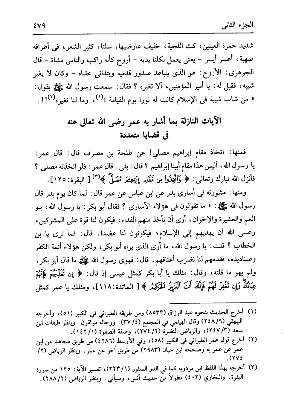 فَمِنْهَا اتِّخَاذ مقَام إِبْرَاهِيم مصلى عَن طَلْحَة بن مصرف قَالَ قَالَ عمر يَا رَسُول الله أَلَيْسَ هَذَا مقَام أَبينَا إِبْرَاهِيم قَالَ بلَى قِال عمر فَلَو اتخذته مصلى فَأنْزل الله تبَارك وَتَعَالَى {وَاتَّخذُوا مِن مَقامِ إِبرَاهيمَ مُصَلى} الْبَقَرَة 125 وَمِنْهَا مشورته فِي أسَارِي بدر عَن ابْن عَبَّاس عَن عمر قَالَ لما كَانَ يَوْم بدر قَالَ رَسُول الله