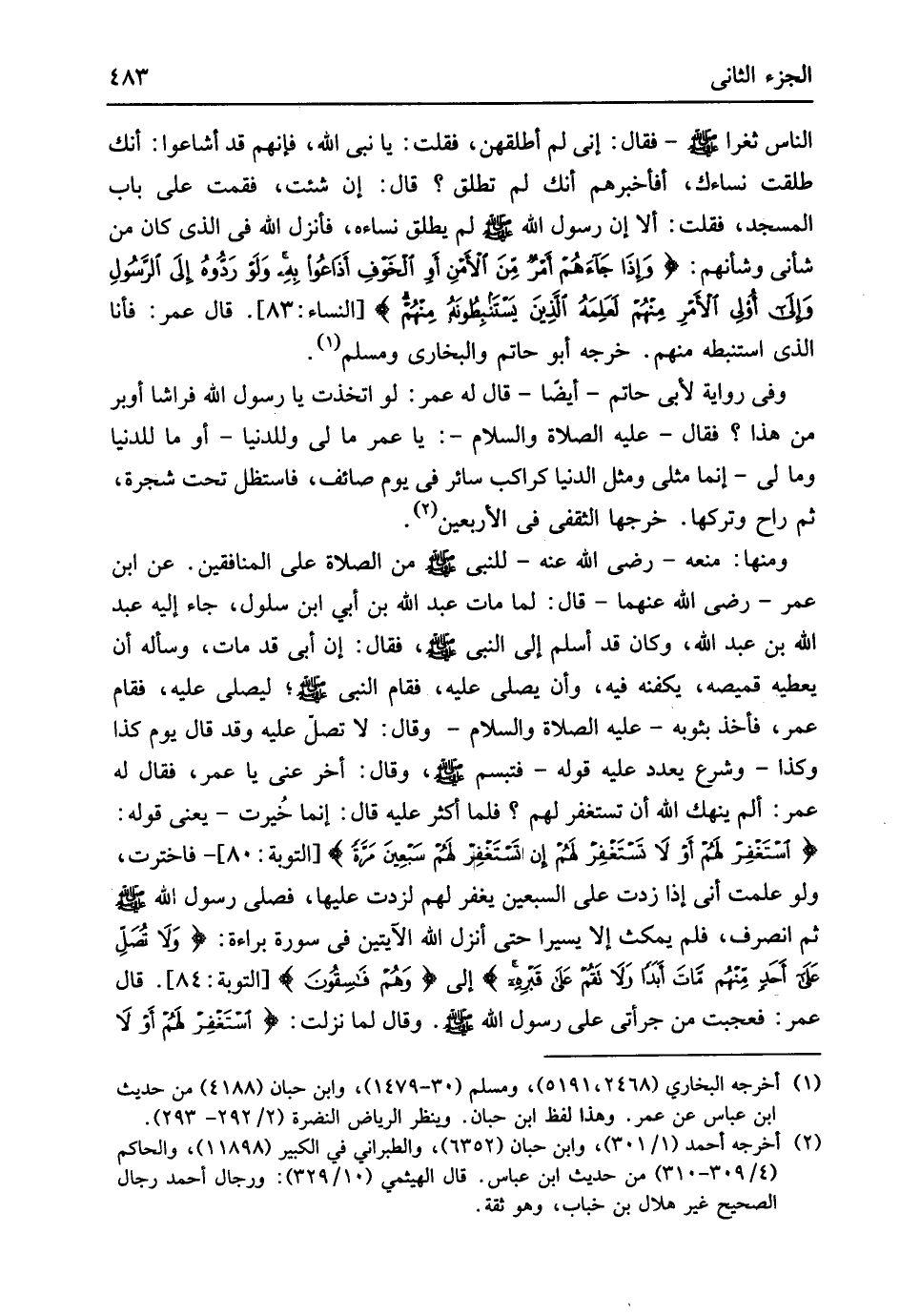 ثمَّ انْصَرف فَلم يمْكث إِلَّا يَسِيرا حَتَّى أنزل الله الْآيَتَيْنِ فِي سُورَة بَرَاءَة {وَلَا تصلِّ عَلَى أحد منهُم ماتَ أبدا وَلا تقُم على قَبرِه} إِلَى {وَهُم فاَسِقُونَ} التَّوْبَة 84 قَالَ عمر فعجبت من جرأتي على رَسُول الله
