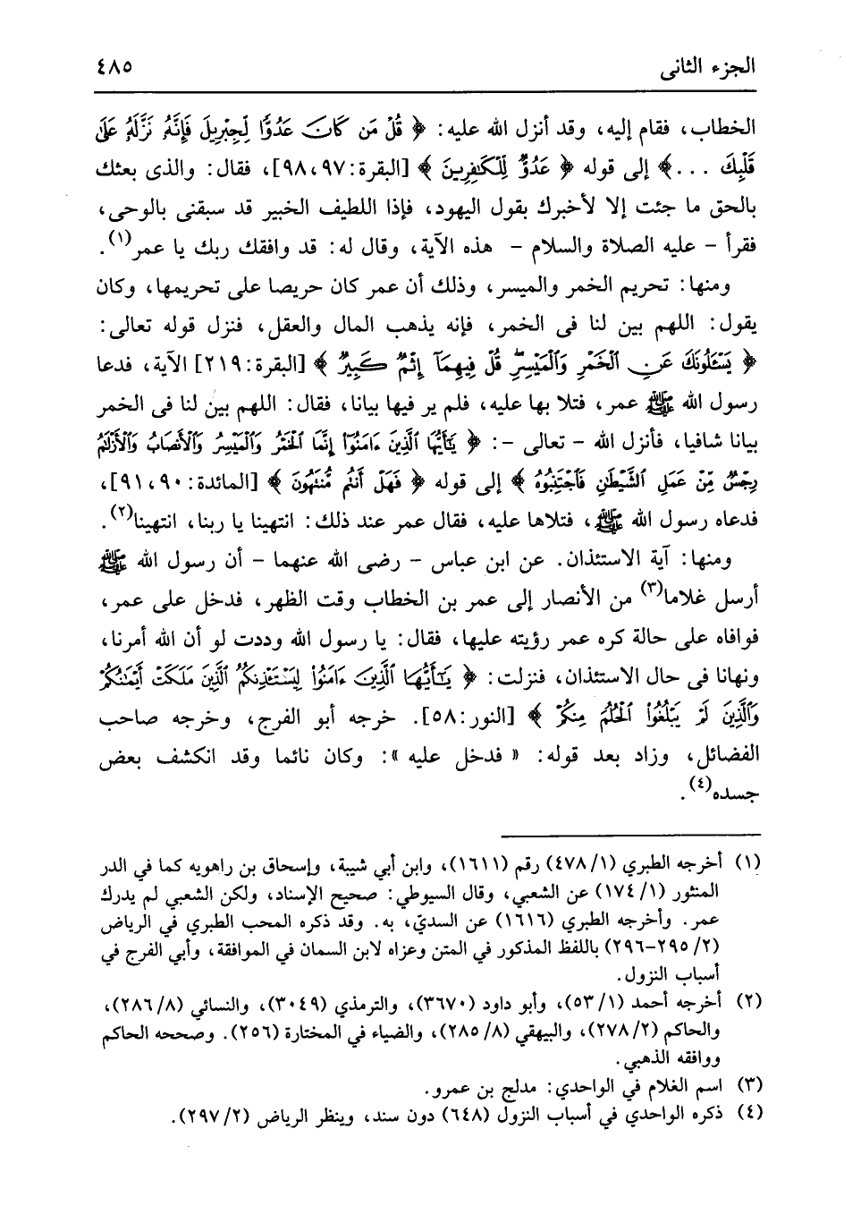 الْخطاب فَقَامَ إِلَيْهِ وَقد أنزل الله عَلَيْهِ {قُل مَن كانَ عَدُوّاً لجِبرِيلَ فَإِنَّهُ نَزله عَلى قَلبِكَ} إِلَى قَوْله {عَدُو للكافِرِينَ} الْبَقَرَة 97، 98 فَقَالَ وَالَّذِي بَعثك بِالْحَقِّ مَا جِئْت إِلَّا لأخبرك بقول الْيَهُود فَإِذا اللَّطِيف الْخَبِير قد سبقني بِالْوَحْي فَقَرَأَ عَلَيْهِ الصَّلَاة وَالسَّلَام هَذِه الْآيَة وَقَالَ لَهُ قد وَافَقَك رَبك يَا عمر وَمِنْهَا تَحْرِيم الْخمر وَالْميسر وَذَلِكَ أَن عمر كَانَ حَرِيصًا على تَحْرِيمهَا وَكَانَ يَقُول اللَّهُمَّ بَين لنا فِي الْخمر فَإِنَّهُ يذهب المَال وَالْعقل فَنزل قَوْله تَعَالَى {يَسْأَلُونَك عَنِ الخمرِ وَاَلمَيسِر قُل فِيهِمَا إِثمِ كَبِير} الْبَقَرَة 219 الْآيَة فَدَعَا رَسُول الله