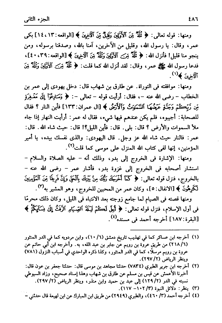عمر وَقَالَ لقد أنزل الله كَمَا قلت {ثُلة مِنَ الأوَلينَ وَثُلَه مِنَ الآخِرينَ} وَمِنْهَا مُوَافَقَته فِي التَّوْرَاة عَن طَارق بن شهَاب قَالَ دخل يَهُودِيّ إِلَى عمر بن الْخطاب رَضِي الله عَنهُ فَقَالَ أَرَأَيْت قَوْله تَعَالَى {وَسارِعُوا إِلىَ مَغْفِرَة من ربكُم وَجنَةٍ عَرضها السمَاواتُ والأرضُ} آل عمرَان 133 فَأَيْنَ النَّار فَقَالَ للصحابة أَجِيبُوهُ فَلم يكن عِنْدهم فِيهَا شَيْء فَقَالَ لَهُ عمر أَرَأَيْت النَّهَار إِذا جَاءَ مَلأ السَّمَوَات وَالْأَرْض قَالَ بلَى قَالَ فَأَيْنَ اللَّيْل قَالَ حَيْثُ شَاءَ الله قَالَ عمر فَالنَّار حَيْثُ شَاءَ الله عز وَجل قَالَ الْيَهُودِيّ وَالَّذِي نَفسك بِيَدِهِ يَا أَمِير الْمُؤمنِينَ إِنَّهَا لفي كتاب لله الْمنزل على مُوسَى كَمَا قلت وَمِنْهَا الْإِشَارَة فِي الْخُرُوج إِلَى بدر وَذَلِكَ أَنه عَلَيْهِ الصَّلَاة وَالسَّلَام اسْتَشَارَ أَصْحَابه فِي الْخُرُوج إِلَى غَزْوَة بدر فَأَشَارَ عمر رَضِي الله عَنهُ بِالْخرُوجِ فَنزل قَوْله تَعَالَى {كَما أخرَجَكَ رَبكَ مِن بَيتك باَلحق وَإنَّ فَرِيقاً مِنَ اَلمُؤمنِينَ لَكارِهُونَ} الْأَنْفَال 5 وَكَانَ عمر من المحبين لِلْخُرُوجِ وَهُوَ المشير بِهِ وَمِنْهَا قصَّته فِي الصّيام لما جَامع زَوجته بعد الانتباه فِي اللَّيْل وَكَانَ ذَلِك محرما فِي أول الْإِسْلَام فَنزل قَوْله تَعَالَى {أحل لُكم ليلَةَ الصِيامِ الرفَثُ إِلَى نسائكن} الْبَقَرَة 187 أخرجه أَحْمد فِي مُسْنده