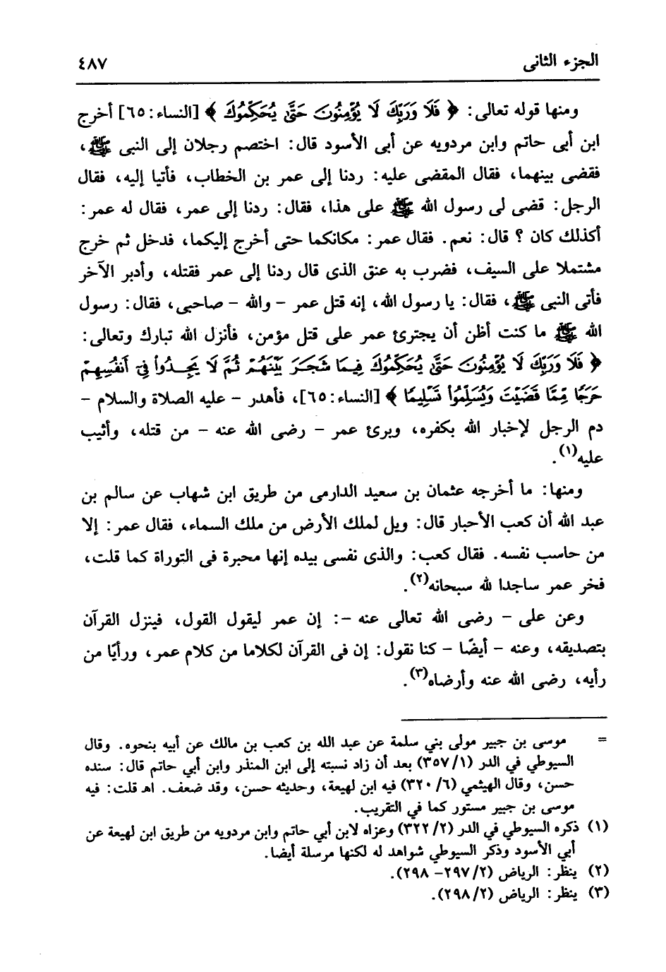 مَا كنت أَظن أَن يجترىء عمر على قتل مُؤمن فَأنْزل الله تبَارك وَتَعَالَى {فَلا وَرَبك لَا يؤمِنونَ حَتَى يُحَكَموُكَ فِيمَا شجر بَينهم ثمَّ لَا يَجدوا فِي أنفسهم حرجا مِمَّا قضيت وَيسُلِموُا تسلِيماً} النِّسَاء 65 فأهدر عَلَيْهِ الصَّلَاة وَالسَّلَام دم الرجل لإخبار الله بِكُفْرِهِ وبرىء عمر رَضِي الله عَنهُ من قَتله وأثيب عَلَيْهِ وَمِنْهَا مَا أخرجه عُثْمَان بن سعيد الدَّارمِيّ من طَرِيق ابْن شهَاب عَن سَالم بن عبد الله أَن كَعْب الْأَحْبَار قَالَ ويل لملك الأَرْض من ملك السَّمَاء فَقَالَ عمر إِلَّا من حاسب نَفسه فَقَالَ كَعْب وَالَّذِي نَفسِي بِيَدِهِ إِنَّهَا محبرة فِي التَّوْرَاة كَمَا قلت فَخر عمر سَاجِدا لله سُبْحَانَهُ وَعَن عَليّ رَضِي الله تَعَالَى عَنهُ إِن عمر ليقول القَوْل فَينزل الْقرَان بتصديقه وَعنهُ أَيْضا كُنَّا نقُول إِن فِي الْقُرْآن لكلاماً من كَلَام عمر ورأياً من رَأْيه رَضِي الله عَنهُ وأرضاه