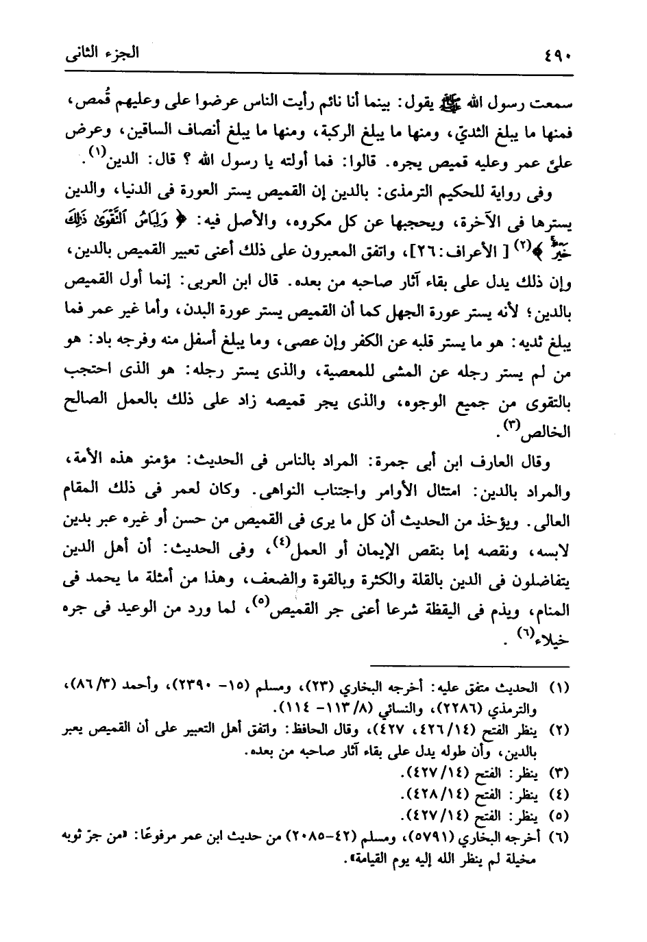 يَقُول بَيْنَمَا أَنا نَائِم رَأَيْت النَّاس عرضوا على وَعَلَيْهِم قُمص فَمِنْهَا مَا يبلغ الثدي وَمِنْهَا مَا يبلغ الرّكْبَة وَمِنْهَا مَا يبلغ أَنْصَاف السَّاقَيْن وَعرض عَليّ عمر وَعَلِيهِ قَمِيص يجره قَالُوا فَمَا أولته يَا رَسُول الله قَالَ الدّين وَفِي رِوَايَة للحكيم التِّرْمِذِيّ بِالدّينِ إِن الْقَمِيص يستر الْعَوْرَة فِي الدُّنْيَا وَالدّين يَسْتُرهَا فِي الْآخِرَة ويحجبها عَن كل مَكْرُوه وَالْأَصْل فِيهِ {وَلباسُ التَّقْوَى ذَلِك خير} الْأَعْرَاف 26 وَاتفقَ المعبرون على ذَلِك أَعنِي تَعْبِير الْقَمِيص بِالدّينِ وَإِن ذَلِك يدل على بَقَاء آثَار صَاحبه من بعده قَالَ ابْن الْعَرَبِيّ إِنَّمَا أول الْقَمِيص بِالدّينِ لِأَنَّهُ يستر عَورَة الْجَهْل كَمَا أَن الْقَمِيص يستر عَورَة الْبدن وَأما غير عمر فَمَا يبلغ ثديه هُوَ مَا يستر قلبه عَن الْكفْر وَإِن عصى وَمَا يبلغ أَسْفَل مِنْهُ وفرجه باد هُوَ من لم يستر رجله عَن الْمَشْي للمعصية وَالَّذِي يستر رجله هُوَ الَّذِي احتجب بالتقوى من جَمِيع الْوُجُوه وَالَّذِي يجر قَمِيصه زَاد على ذَلِك بِالْعَمَلِ الصَّالح الْخَالِص وَقَالَ الْعَارِف ابْن أبي حَمْزَة المُرَاد بِالنَّاسِ فِي الحَدِيث مؤمنو هَذِه الْأمة وَالْمرَاد بِالدّينِ امْتِثَال الْأَوَامِر وَاجْتنَاب النواهي وَكَانَ لعمر فِي ذَلِك الْمقَام العالي وَيُؤْخَذ من الحَدِيث أَن كل مَا يرى فِي الْقَمِيص من حسن أَو غَيره عبر بدين لابسه ونقصه إِمَّا بِنَقص الْإِيمَان أَو الْعَمَل وَفِي الحَدِيث أَن أهل الدّين يتفاضلون فِي الدّين بالقلة وَالْكَثْرَة وبالقوة والضعف وَهَذَا من أَمْثِلَة مَا يحمد فِي الْمَنَام ويذم فِي الْيَقَظَة شرعا أَعنِي جر الْقَمِيص لما ورد من الْوَعيد فِي جَرّه خُيَلَاء