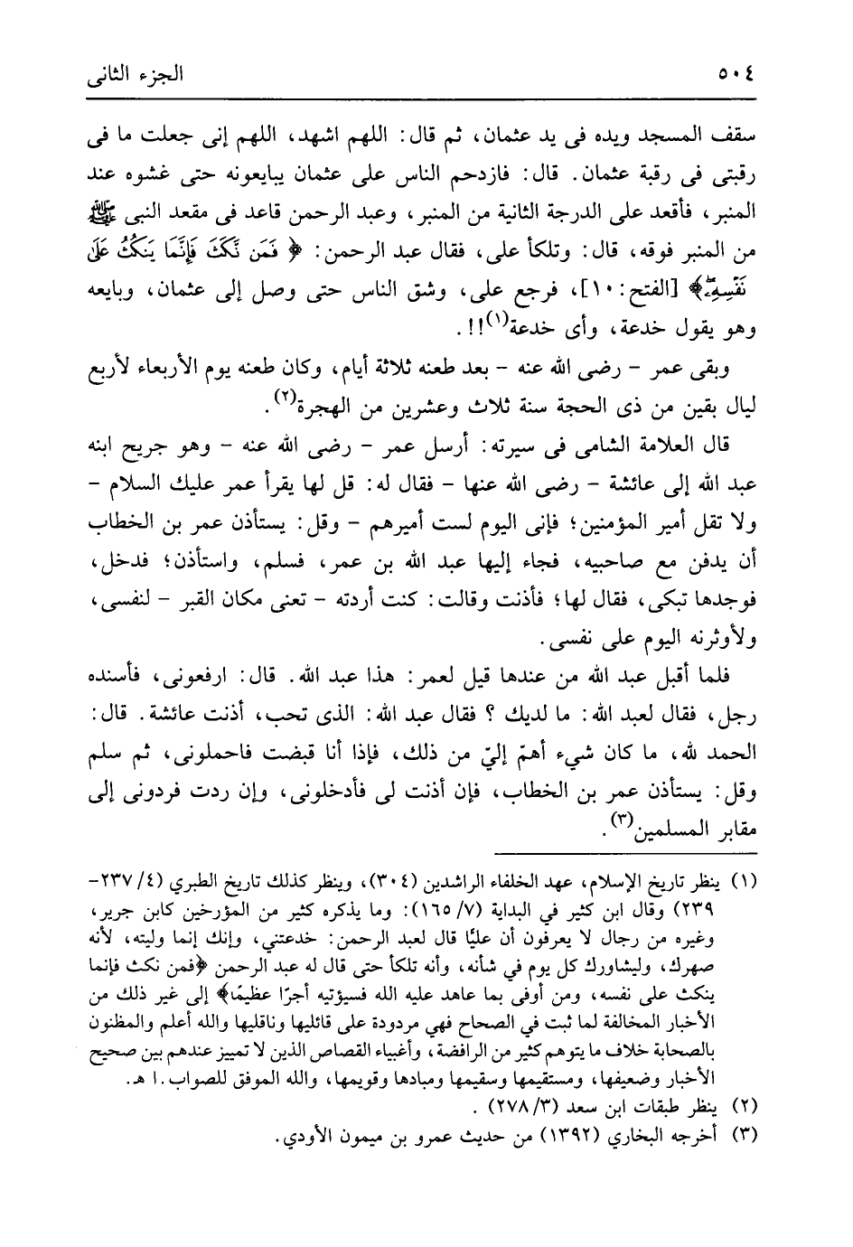 من الْمِنْبَر فَوْقه قَالَ وتلكأ عَليّ فَقَالَ عبد الرَّحْمَن {فَمَن نكَثَ فَإِنَّمَا يَنكُثُ عَلى نَفسِه} الْفَتْح 10 فَرجع عَليّ وشق النَّاس حَتَّى وصل إِلَى عُثْمَان وَبَايَعَهُ وَهُوَ يَقُول خدعة وَأي خدعة وَبَقِي عمر رَضِي الله عَنهُ بعد طعنه ثَلَاثَة أَيَّام وَكَانَ طعنه يَوْم الْأَرْبَعَاء لأَرْبَع لَيَال بَقينَ من ذِي الْحجَّة سنة ثَلَاث وَعشْرين من الْهِجْرَة قَالَ الْعَلامَة الشَّامي فِي سيرته أرسل عمر رَضِي الله عَنهُ وهوجريح ابْنه عبد الله إِلَى عَائِشَة رَضِي الله عَنْهَا فَقَالَ لَهُ قل لَهَا يقْرَأ عمر عَلَيْك السَّلَام وَلَا تقل أَمِير الْمُؤمنِينَ فَإِنِّي الْيَوْم لست أَمِيرهمْ وَقل يسْتَأْذن عمر بن الْخطاب أَن يدْفن مَعَ صَاحِبيهِ فجَاء إِلَيْهَا عبد الله بن عمر فَسلم وَاسْتَأْذَنَ فَدخل فَوَجَدَهَا تبْكي فَقَالَ لَهَا فَأَذنت وَقَالَت كنت أردته تَعْنِي مَكَان الْقَبْر لنَفْسي ولأوثرنه الْيَوْم على نَفسِي فَلَمَّا أقبل عبد الله من عِنْدهَا قيل لعمر هَذَا عبد الله قَالَ ارفعوني فأسنده رجل فَقَالَ لعبد الله مَا لديك فَقَالَ عبد الله الَّذِي تحب أَذِنت عَائِشَة قَالَ الْحَمد لله مَا كَانَ شَيْء أهم إِلَيّ من ذَلِك فَإِذا أَنا قبضت فاحملوني ثمَّ سلم وَقل يسْتَأْذن عمر بن الْخطاب فَإِن أَذِنت لي فأدخلوني وَإِن ردَّتْ فردوني إِلَى مَقَابِر الْمُسلمين
