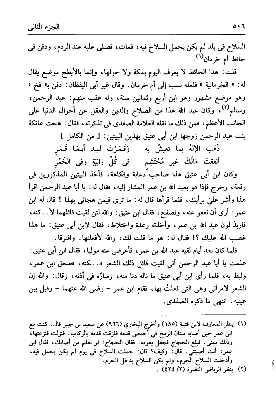 السِّلَاح فِي بلد لم يكن يحمل السِّلَاح فِيهِ فَمَاتَ فَصلي عَلَيْهِ عِنْد الرَّدْم وَدفن فِي حَائِط أم خرمان قلت هَذَا الْحَائِط لَا يعرف الْيَوْم بِمَكَّة وَلَا حولهَا وَإِنَّمَا بِالْأَبْطح مَوضِع يُقَال لَهُ الخرمانية فَلَعَلَّهُ نسب إِلَى أم خرمان وَقَالَ غير أبي الْيَقظَان دفن بفخ وَهُوَ مَوضِع مَشْهُور وَهُوَ ابْن أَربع وَثَمَانِينَ سنة وَله عقب مِنْهُم عبد الرَّحْمَن وَسَالم وَكَانَ عبد الله هَذَا من الصّلاح وَالدّين وَالْعقل عَن أَحْوَال الدُّنْيَا على الْجَانِب الْأَعْظَم فَمن ذَلِك مَا نَقله الْعَلامَة الصَّفَدِي فِي تَذكرته فَقَالَ هجت عَاتِكَة بنت عبد الرَّحْمَن زَوجهَا ابْن أبي عَتيق بِهَذَيْنِ الْبَيْتَيْنِ // (من الْكَامِل) //