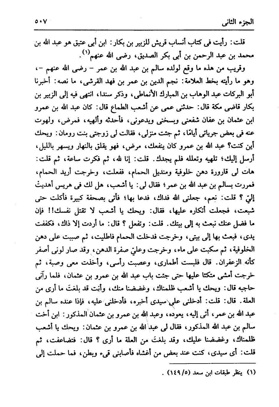 قلت رَأَيْت فِي كتاب أَنْسَاب قُرَيْش للزبير بن بكار ابْن أبي عَتيق هُوَ عبد الله بن مُحَمَّد بن عبد الرَّحْمَن بن أبي بكر الصّديق رَضِي الله عَنْهُم وَقَرِيب من هَذِه مَا وَقع لوَلَده سَالم بن عبد الله بن عمر رَضِي الله عَنْهُم وَهُوَ مَا رَأَيْته بِخَط الْعَلامَة نجم الدّين بن عمر بن فَهد الْقرشِي مَا نَصه أخبرنَا أَبُو البركات عبد الْوَهَّاب بن الْمُبَارك الْأنمَاطِي وَذكر سنداً انْتهى فِيهِ إِلَى الزبير بن بكار قَاضِي مَكَّة قَالَ حَدثنِي عمي عَن أشعب الطماع قَالَ كَانَ عبد الله بن عَمْرو ابْن عُثْمَان بن عَفَّان شفعني وبسخني ويدعوني فأحدثه وألهيه فَمَرض ولهوت عَنهُ فِي بعض جرياتي أَيَّامًا ثمَّ جِئْت منزلي فَقَالَت لي زَوْجَتي بنت رُومَان وَيحك أَيْن كنت عبد الله بن عَمْرو كَانَ ينفعك مرض فَهُوَ يقلق بِالنَّهَارِ ويسهر بِاللَّيْلِ أرسل إِلَيْك تلهيه وتعلله فَلم يجدك قلت إِنَّا لله ثمَّ فَكرت سَاعَة ثمَّ قلت هَات لي قَارُورَة دهن خلوفية ومنديل الْحمام فَفعلت وَخرجت أُرِيد الْحمام فمررت بسالم بن عبد الله بن عمر فَقَالَ لي يَا أشعب هَل لَك فِي هريس أهديتْ إِلَيّ قلت نعم جعلني الله فدَاك فَدَعَا بهَا فَأتى بصحفة كَبِيرَة فَأكلت حَتَّى شبعت فَجعلت أتكاره عَلَيْهَا فَقَالَ وَيحك يَا أشعب لَا تقتل نَفسك فَإِن مَا فضل عَنْك نبعث بِهِ إِلَى بَيْتك قلت وَتفعل قَالَ مَا أردْت إِلَّا ذَاك فكففت يَدي فَبعث بهَا إِلَى بَيْتِي وَخرجت فَدخلت الْحمام فاطليت ثمَّ صببت عَليّ دهن الخلوفية ثمَّ سكبت عَليّ مَاء وَخرجت وَعلي صفرَة الدّهن وَقد صَار لوني أصفر كَأَنَّهُ الزَّعْفَرَان قَالَ فَلبِست أطماري وعصبت رَأْسِي وَأخذت معي وصبة ثمَّ خرجت أَمْشِي مُتكئا عَلَيْهَا حَتَّى جِئْت بَاب عبد الله بن عَمْرو بن عُثْمَان فَلَمَّا رأني حَاجِبه قَالَ وَيحك يَا أشعب ظَلَمْنَاك وغضضنا مِنْك وَأَنت قد بلغتَ مَا أرى من الْعلَّة قَالَ قلت أدخلني على سَيِّدي أخبرهُ فَأَدْخلنِي عَلَيْهِ فَإِذا عِنْده سَالم بن عبد الله بن عمر أَتَى إِلَيْهِ يعودهُ وَعبد الله بن عَمْرو بن عُثْمَان الْمَذْكُور ابْن أُخْت سَالم بن عبد الله الْمَذْكُور فَقَالَ لي عبد الله بن عَمْرو بن عُثْمَان وَيحك يَا أشعب ظَلَمْنَاك وغضضنا عَلَيْك وَقد بلغتَ من الْعلَّة مَا أرى قَالَ فتضاعفت ثمَّ قلت أَي سَيِّدي كنت عِنْد بعض من أغشاه فأصابنى قئ وبطن فَمَا حملت إِلَى
