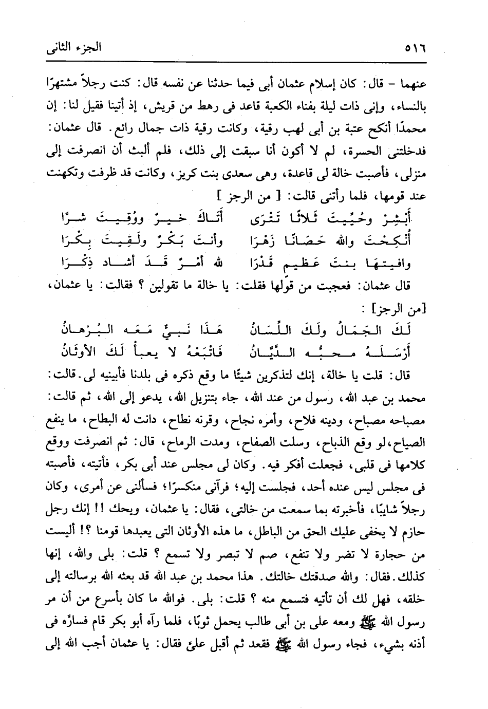 عَنْهُمَا قَالَ كَانَ إِسْلَام عُثْمَان أبي فِيمَا حَدثنَا عَن نَفسه قَالَ كنت رجلا مشتهراً بِالنسَاء وَإِنِّي ذَات لَيْلَة بِفنَاء الْكَعْبَة قَاعد فِي رَهْط من قُرَيْش إِذْ أَتَيْنَا فَقيل لنا إِن مُحَمَّدًا أنكح عتبَة بن أبي لَهب رقية وَكَانَت رقية ذَات جمال رائع قَالَ عُثْمَان فدخلتني الْحَسْرَة لم لَا أكون أَنا سبقت إِلَى ذَلِك فَلم ألبث أَن انصرفت إِلَى منزلي فَأَصَبْت خَالَة لي قَاعِدَة وهى سعدى بنت كريز وَكَانَت قد ظرفت وتكهنت عِنْد قَومهَا فَلَمَّا رأتني قَالَت // (من الرجز) //