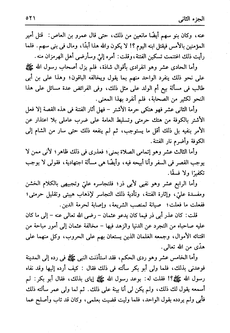 عَنهُ وَكَانَ بَنو سهم أَيْضا مانعين من ذَلِك حَتَّى قَالَ عَمْرو بن الْعَاصِ قتل أَمِير الْمُؤمنِينَ بالْأَمْس فَيقْتل ابْنه الْيَوْم لَا يكون وإلله هَذَا أبدا وَمَال فِي بني سهم فَلَمَّا رَأَيْت ذَلِك اغتنمت تسكين الْفِتْنَة وَقلت أمره إِلَيّ وسأرضي أهل الهرمزان مِنْهُ وَأما الْحَادِي عشر وَهُوَ انفرادي بأقوال شَاذَّة فَلم يزل أَصْحَاب رَسُول الله