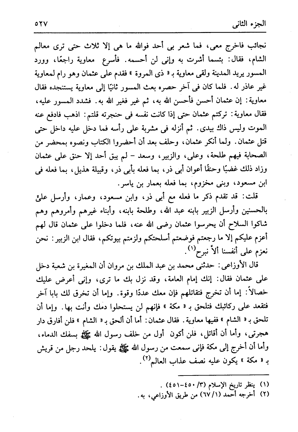 نَجَائِب فَاخْرُج معي فَمَا شعر بِي أحد فوَاللَّه مَا هِيَ إِلَّا ثَلَاث حَتَّى ترى معالم الشَّام فَقَالَ بئْسَمَا أَشرت بِهِ وَإِنِّي لن أحسمه فأسرع مُعَاوِيَة رَاجعا وَورد الْمسور يُرِيد الْمَدِينَة وَلَقي مُعَاوِيَة ذِي الْمَرْوَة فَقدم على عُثْمَان وَهُوَ رام لمعاوية غير عاذر لَهُ فَلَمَّا كَانَ فِي آخر حصره بعث الْمسور ثَانِيًا إِلَى مُعَاوِيَة يستنجده فَقَالَ مُعَاوِيَة إِن عُثْمَان أحسن فَأحْسن الله بِهِ ثمَّ غير فَغير الله بِهِ فَشدد الْمسور عَلَيْهِ فَقَالَ مُعَاوِيَة تركْتُم عُثْمَان حَتَّى إِذا كَانَت نَفسه فِي حنجرته قُلْتُمْ اذْهَبْ فادفع عَنهُ الْمَوْت وَلَيْسَ ذَاك بيَدي ثمَّ أنزلهُ فِي مشربَة على رَأسه فَمَا دخل عَلَيْهِ دَاخل حَتَّى قتل عُثْمَان وَلما أنكر عُثْمَان وَحلف بعد أَن أحضروا الْكتاب ونصوه بِمحضر من الصَّحَابَة فيهم طَلْحَة وَعلي وَالزُّبَيْر وَسعد لم يبْق أحد إِلَّا حنق على عُثْمَان وَزَاد ذَلِك غَضبا وحنقاً أعوان أَي ذَر بِمَا فعله بِأبي ذَر وقبيلة هُذَيْل بِمَا فعله فِي ابْن مَسْعُود وَبني مَخْزُوم بِمَا فعله بِعَمَّار بن يَاسر قلت قد تقدم ذكر مَا فعله مَعَ أبي ذَر وَابْن مَسْعُود وعمار وَأرْسل عَليّ بالحسنين وَأرْسل الزبير بِابْنِهِ عبد الله وَطَلْحَة بِابْنِهِ وَأَبْنَاء غَيرهم وَأمرُوهُمْ وهم شاكوا السِّلَاح أَن يحرسوا عُثْمَان رَضِي الله عَنهُ فَلَمَّا دخلُوا على عُثْمَان قَالَ لَهُم أعزم عَلَيْكُم إِلَّا مَا رجعتم فوضعتم أسلحتكم ولزمتم بُيُوتكُمْ فَقَالَ ابْن الزبير نَحن نعزم على أَنْفُسنَا أَلا نَبْرَح قَالَ الْأَوْزَاعِيّ حَدَّثَنى مُحَمَّد بن عبد الْملك بن مَرْوَان أَن الْمُغيرَة بن شُعْبَة دخل على عُثْمَان فَقَالَ إِنَّك إِمَام الْعَامَّة وَقد نزل بك مَا ترى وَإِنِّي أعرض عَلَيْك خِصَالًا إِمَّا أَن تخرج فَنُقَاتِلهُمْ فَإِن مَعَك عددا وَقُوَّة وَإِمَّا أَن تخرق لَك بَابا آخر فتقعد على ركائبك فتلحق ب مَكَّة فَإِنَّهُم لن يستحلوا دمك وَأَنت بهَا وَإِمَّا أَن تلْحق بِالشَّام فَفِيهَا مُعَاوِيَة فَقَالَ عُثْمَان أما أَن ألحق بِالشَّام فَلَنْ أُفَارِق دَار هجرتي وَأما أَن أقَاتل فَلَنْ أكون أول من خلف رَسُول الله
