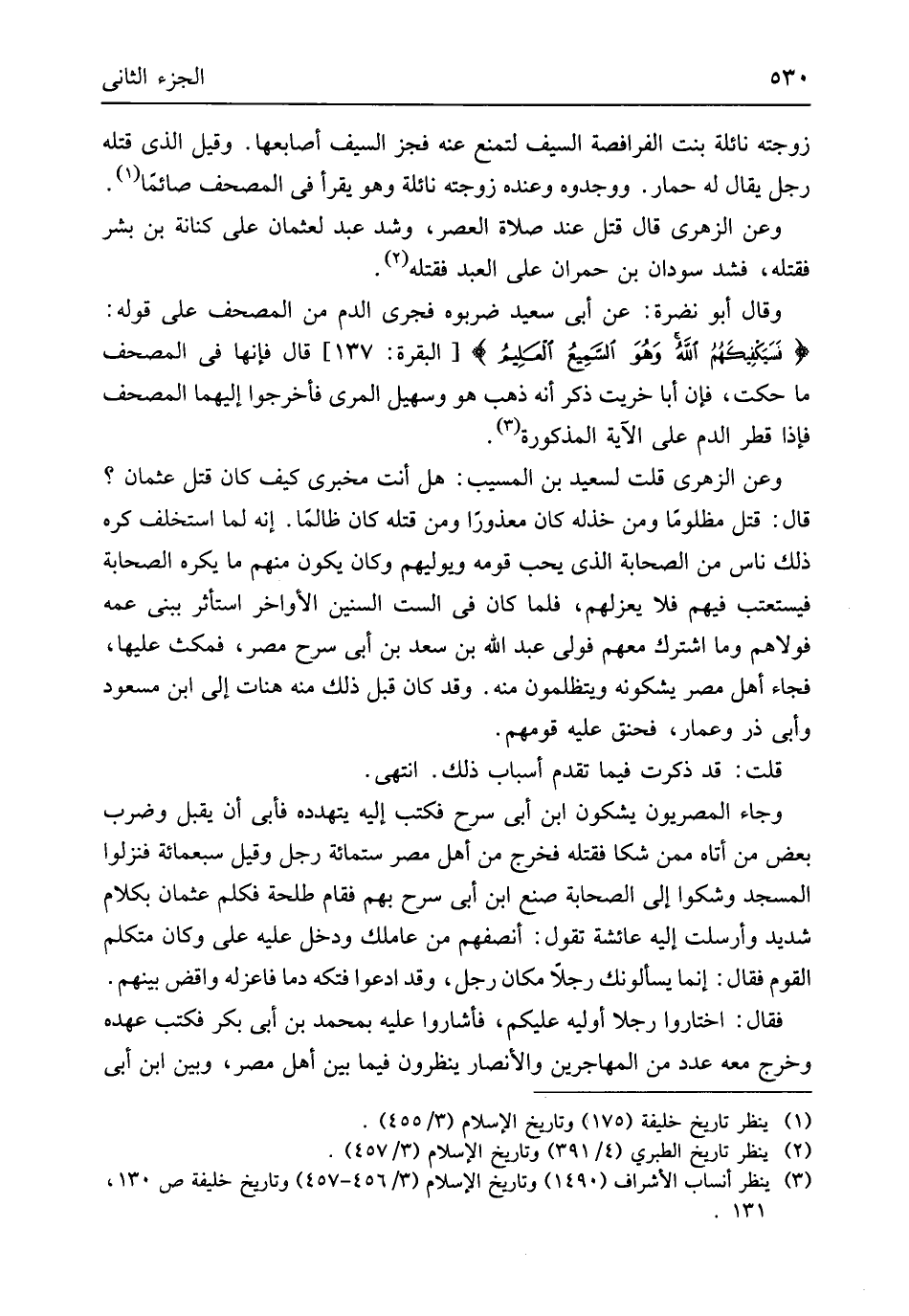 زَوجته نائلة بنت الفرافصة السَّيْف لتمنع عَنهُ فجز السَّيْف أصابعها وَقيل الَّذِي قَتله رجل يُقَال لَهُ حمَار ووجدوه وَعِنْده زَوجته نائلة وَهُوَ يقْرَأ فِي الْمُصحف صَائِما وَعَن الزُّهْرِيّ قَالَ قتل عِنْد صَلَاة الْعَصْر وَشد عبد لعُثْمَان على كنَانَة بن بشر فَقتله فَشد سودان بن حمْرَان على العَبْد فَقتله وَقَالَ أَبُو نَضرة عَن أبي سعيد ضربوه فَجرى الدَّم فِي الْمُصحف على قَوْله {فَسَيَكفِيكَهُمُ الله وَهُوَ السَمِيع العَلِيم} الْبَقَرَة 137 قَالَ فَإِنَّهَا فِي الْمُصحف مَا حكت فَإِن أَبَا خريت ذكر أَنه ذهب هُوَ وَسُهيْل المري فأخرجوا إِلَيْهِمَا الْمُصحف فَإِذا قطر الدَّم على الْآيَة الْمَذْكُورَة وَعَن الزُّهْرِيّ قلت لسَعِيد بن الْمسيب هَل أَنْت مخبري كَيفَ كَانَ قتل عُثْمَان قَالَ قتل مَظْلُوما وَمن خذله كَانَ مَعْذُورًا وَمن قَتله كَانَ ظَالِما إِنَّه لما اسْتخْلف كره ذَلِك نَاس من الصَّحَابَة الَّذِي يحب قومه ويوليهم وَكَانَ يكون مِنْهُم مَا يكره الصَّحَابَة فيستعتب فيهم فَلَا يعزلهم فَلَمَّا كَانَ فِي السِّت السنين الْأَوَاخِر اسْتَأْثر ببني عَمه فولاهم وَمَا اشْترك مَعَهم فولى عبد الله بن سعد بن أبي سرح مصر فَمَكثَ عَلَيْهَا فجَاء أهل مصر يشكونه ويتظلمون مِنْهُ وَقد كَانَ قبل ذَلِك مِنْهُ هَنَات إِلَى ابْن مَسْعُود وَأبي ذَر وعمار فحنق عَلَيْهِ قَومهمْ قلت قد ذكرت فِيمَا تقدم أَسبَاب ذَلِك انْتهى وَجَاء المصريون يَشكونَ ابْن أبي سرح فَكتب إِلَيْهِ يتهدده فَأبى أَن يقبل وَضرب بعض من أَتَاهُ مِمَّن شكا فَقتله فَخرج من أهل مصر سِتّمائَة رجل وَقيل سَبْعمِائة فنزلوا الْمَسْجِد وَشَكوا إِلَى الصَّحَابَة صنع ابْن أبي سرح بهم فَقَامَ طَلْحَة فَكلم عُثْمَان بِكَلَام شَدِيد وَأرْسلت إِلَيْهِ عَائِشَة تَقول أنصفهم عَن عاملك وَدخل عَلَيْهِ عَليّ وَكَانَ مُتَكَلم الْقَوْم فَقَالَ إِنَّمَا يَسْأَلُونَك رجلا مَكَان رجل وَقد ادعوا فتكه دَمًا فاعزله واقض بَينهم فَقَالَ اخْتَارُوا رجلا أوليه عَلَيْكُم فأشاروا عَلَيْهِ بِمُحَمد بن أبي بكر فَكتب عَهده وَخرج مَعَه عدد من الْمُهَاجِرين وَالْأَنْصَار ينظرُونَ فِيمَا بَين أهل مصر وَبَين ابْن أبي