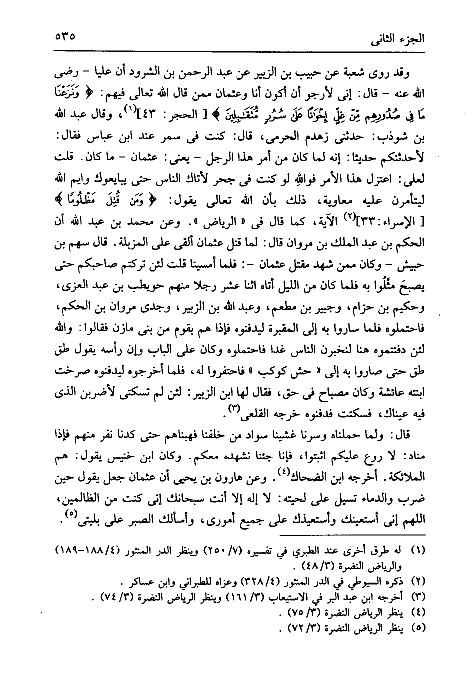 وَقد روى شُعْبَة عَن حبيب بن الزبير عَن عبد الرَّحْمَن بن الشرود أَن عليا رَضِي الله عَنهُ قَالَ إِنِّي لأرجو أَن أكون أَنا وَعُثْمَان مِمَّن قَالَ الله تَعَالَى فيهم {وَنَزَعْنَا مَا فِي صُدُورهمْ من غل إخْوَانًا علىَ سُرُر متقابليِنَ} الْحجر 43 وَقَالَ عبد الله بن شَوْذَب حَدثنِي زَهْدَم الحرمي قَالَ كنت فِي سمر عِنْد ابْن عَبَّاس فَقَالَ لأحدثنكم حَدِيثا إِنَّه لما كَانَ من أَمر هَذَا الرجل يَعْنِي عُثْمَان مَا كَانَ قلت لعَلي اعتزل هَذَا الْأَمر فوَاللَّه لَو كنت فِي جُحر لأتاك النَّاس حَتَّى يبايعوك وأيم الله ليتأمرن عَلَيْهِ مُعَاوِيَة ذَلِك بِأَن الله تَعَالَى يَقُول {وَمَن قُتِلَ مَظلُوماً} الْإِسْرَاء 33 الْآيَة كَمَا قَالَ فِي الرياض وَعَن مُحَمَّد بن عبد الله أَن الحكم بن عبد الْملك بن مَرْوَان قَالَ لما قتل عُثْمَان ألقِي على المزبلة قَالَ سهم بن حُبَيْش وَكَانَ مِمَّن شهد مقتل عُثْمَان فَلَمَّا أمسينا قلت لَئِن تركْتُم صَاحبكُم حَتَّى يصبحَ مثلُوا بِهِ فَلَمَّا كَانَ من اللَّيْل أَتَاهُ اثْنَا عشر رجلا مِنْهُم حويطب بن عبد الْعُزَّى وَحَكِيم بن حزَام وَجبير بن مطعم وَعبد الله بن الزبير وجدي مَرْوَان بن الحكم فاحتملوه فَلَمَّا سَارُوا بِهِ إِلَى الْمقْبرَة ليدفنوه فَإِذا هم بِقوم من بني مَازِن فَقَالُوا وَالله لَئِن دفنتموه هُنَا لنخبرن النَّاس غَدا فاحتملوه وَكَانَ على الْبَاب وَإِن رَأسه يَقُول طق طق حَتَّى صَارُوا بِهِ إِلَى حش كَوْكَب فاحتفروا لَهُ فَلَمَّا أَخْرجُوهُ ليدفنوه صرخت ابْنَته عَائِشَة وَكَانَ مِصْبَاح فِي حق فَقَالَ لَهَا ابْن الزبير لَئِن لم تسكتي لَأَضرِبَن الَّذِي فِيهِ عَيْنَاك فَسَكَتَتْ فدفنوه خرجه القلعي قَالَ وَلما حملناه وسرنا غشينا سَواد من خلفنا فهبناهم حَتَّى كدنا نفر مِنْهُم فَإِذا مُنَاد لَا روع عَلَيْكُم اثبتوا فَإنَّا جِئْنَا نشهده مَعكُمْ وَكَانَ ابْن خُنَيْس يَقُول هم الْمَلَائِكَة أخرجه ابْن الضَّحَّاك وَعَن هَارُون بن يحيى أَن عُثْمَان جعل يَقُول حِين ضرب والدماء تسيل على لحيته لَا إِلَه إِلَّا أَنْت سُبْحَانَكَ إِنِّي كنت من الظَّالِمين اللَّهُمَّ إِنِّي أستعينك وأستعيذك على جَمِيع أموري وَأَسْأَلك الصَّبْر على بليتي