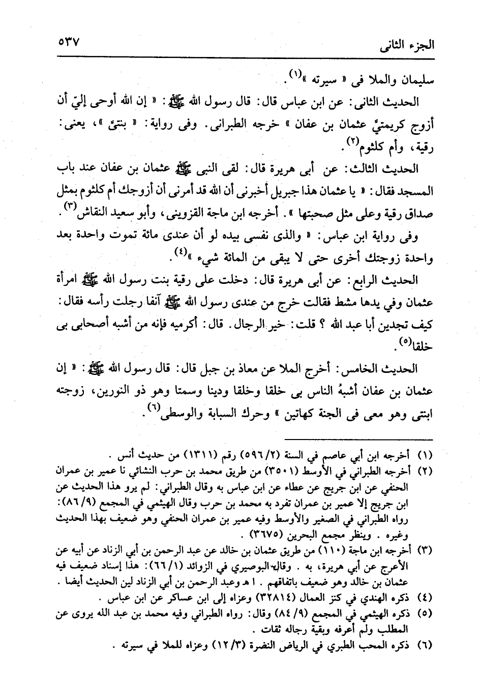 إِن عُثْمَان بن عَفَّان أشبهُ النَّاس بِي خلقا وخلقاً وديناً وسمتاً وَهُوَ ذُو النورين زَوجته ابْنَتي وَهُوَ معي فِي الْجنَّة كهاتين وحرك السبابَة وَالْوُسْطَى