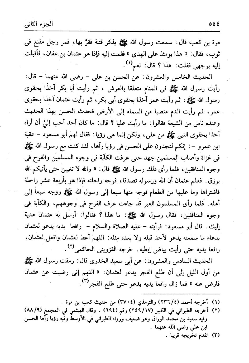 مَا هَذَا فَقَالُوا أرسل بِهِ عُثْمَان هَدِيَّة إِلَيْك قَالَ أَبُو مَسْعُود فرأيته عَلَيْهِ الصَّلَاة وَالسَّلَام رَافعا يَدَيْهِ يَدْعُو لعُثْمَان بِدُعَاء مَا سمعته يَدْعُو لأحد قبله وَلَا بعده مثله اللَّهُمَّ أعْط لعُثْمَان وَافْعل لعُثْمَان رَافعا يَدَيْهِ حَتَّى رَأَيْت بَيَاض إبطَيْهِ خرجه الْقزْوِينِي الحاكمي