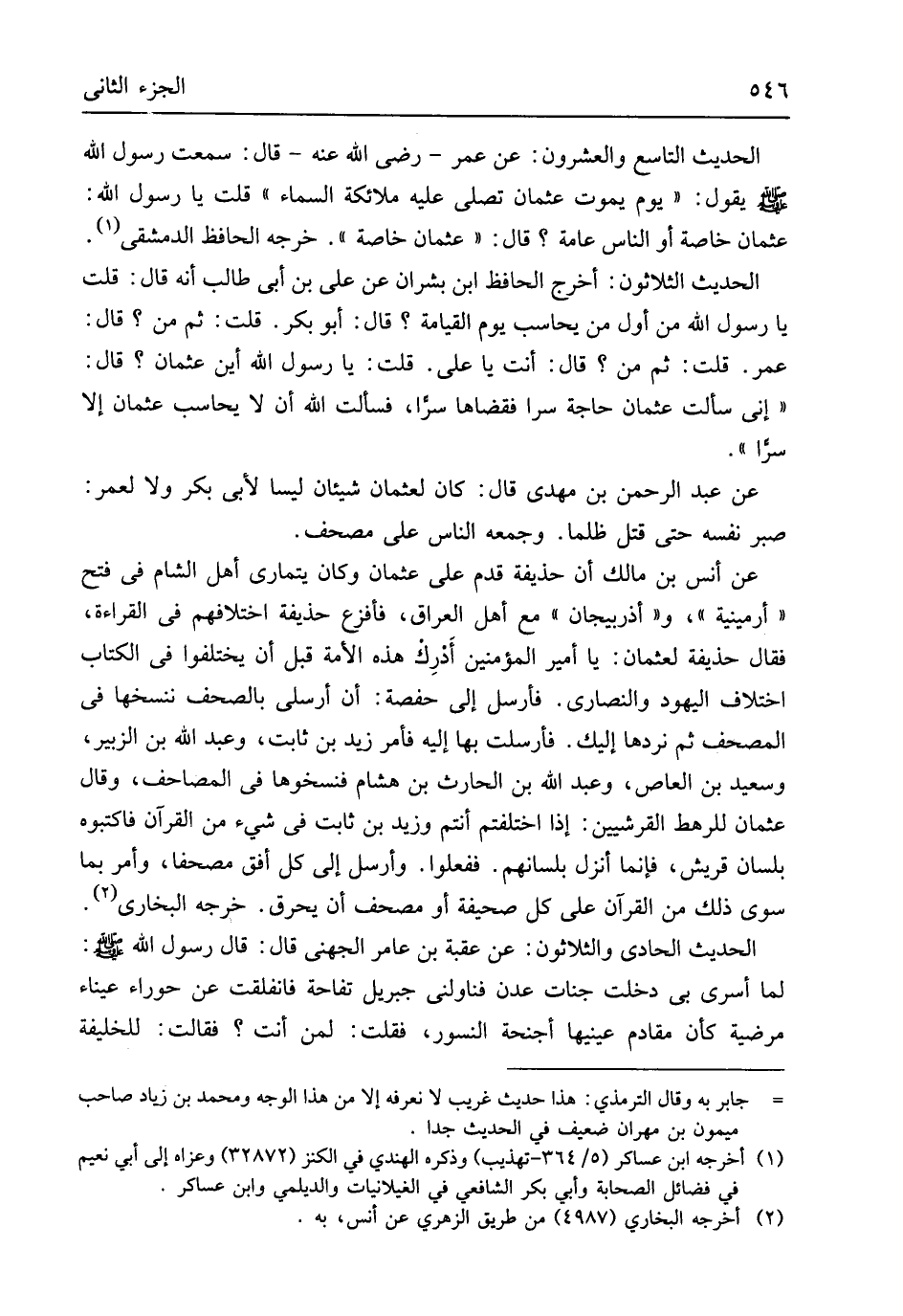 الحَدِيث الثَّلَاثُونَ أخرج الْحَافِظ ابْن بَشرَان عَن عَليّ بن أبي طَالب أَنه قَالَ قلت يَا رَسُول الله من أول من يُحَاسب يَوْم الْقِيَامَة قَالَ أَبُو بكر قلت ثمَّ من قَالَ عمر قلت ثمَّ من قَالَ أَنْت يَا عَليّ قلت يَا رَسُول الله أَيْن عُثْمَان قَالَ إِنِّي سَأَلت عُثْمَان حَاجَة سرا فقضاها سرا فَسَأَلت الله أَن لَا يُحَاسب عُثْمَان إِلَّا سرا عَن عبد الرَّحْمَن بن مهْدي قَالَ كَانَ لعُثْمَان شَيْئَانِ ليسَا لأبى بكر وَلَا لعمر صَبر نَفسه حَتَّى قتل ظلما وَجمعه النَّاس على مصحف عَن أنس بن مَالك أَن حُذَيْفَة قدم على عُثْمَان وَكَانَ يتمارى أهل الشَّام فِي فتح أرمينية وأذربيجان مَعَ أهل الْعرَاق فأفزع حُذَيْفَة اخْتلَافهمْ فِي الْقِرَاءَة فَقَالَ حُذَيْفَة لعُثْمَان يَا أَمِير الْمُؤمنِينَ أدرِك هَذِه الْأمة قبل أَن يَخْتَلِفُوا فِي الْكتاب اخْتِلَاف الْيَهُود وَالنَّصَارَى فَأرْسل إِلَى حَفْصَة أَن أرسلي بالصحف ننسخها فِي الْمُصحف ثمَّ نردها إِلَيْك فَأرْسلت بهَا إِلَيْهِ فَأمر زيد بن ثَابت وَعبد الله بن الزبير وَسَعِيد بن الْعَاصِ وَعبد الله بن الْحَارِث بن هِشَام فنسخوها فِي الْمَصَاحِف وَقَالَ عُثْمَان للرهط القرشيين إِذا اختلفتم أَنْتُم وَزيد بن ثَابت فِي شَيْء من الْقُرْآن فاكتبوه بِلِسَان قُرَيْش فَإِنَّمَا أنزل بلسانهم فَفَعَلُوا وَأرْسل إِلَى كل أفق مُصحفا وَأمر بِمَا سوى ذَلِك من الْقُرْآن على كل صحيفَة أَو مصحف أَن يحرق خرجه البُخَارِيّ