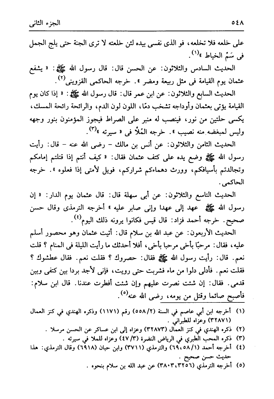 الحَدِيث الْأَرْبَعُونَ عَن عبد الله بن سَلام قَالَ أتيت عُثْمَان وَهُوَ مَحْصُور أسلم عَلَيْهِ فَقَالَ مرْحَبًا بأخي مرْحَبًا بأخي أَفلا أحَدثك مَا رَأَيْت اللَّيْلَة فِي الْمَنَام قلت نعم قَالَ رَأَيْت رَسُول الله