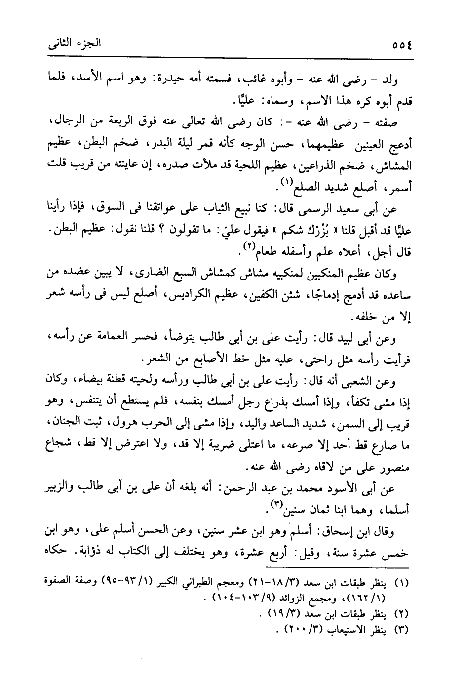 ولد رَضِي الله عَنهُ وَأَبوهُ غَائِب فَسَمتْهُ أمه حيدرة وَهُوَ اسْم الْأسد فَلَمَّا قدم أَبوهُ كره هَذَا الِاسْم وَسَماهُ عليا صفته رَضِي الله عَنهُ كَانَ رَضِي الله تَعَالَى عَنهُ فَوق الربعة من الرِّجَال أدعج الْعَينَيْنِ عظيمهما حسن الْوَجْه كَأَنَّهُ قمر لَيْلَة الْبَدْر ضخم الْبَطن عَظِيم المشاش ضخم الذراعين عَظِيم اللِّحْيَة قد مَلَأت صَدره إِن عاينته من قريب قلت أسمر أصلع شَدِيد الصلع عَن أبي سعيد الرسمي قَالَ كُنَّا نبيع الثِّيَاب على عواتقنا فِي السُّوق فَإِذا رَأينَا عليا قد أقبل قُلْنَا بُزُرك شكم فَيَقُول عَليّ مَا تَقولُونَ قُلْنَا نقُول عَظِيم الْبَطن قَالَ أجل أَعْلَاهُ علم وأسفله طَعَام وَكَانَ عَظِيم الْمَنْكِبَيْنِ لمنكبيه مشاش كمشاش السَّبع الضاري لَا يبين عضده من ساعده قد أدمج إدماجاً شثن الْكَفَّيْنِ عَظِيم الكراديس أصلع لَيْسَ فِي رَأسه شعر إِلَّا من خَلفه وَعَن أبي لبيد قَالَ رَأَيْت عَليّ بن أبي طَالب يتَوَضَّأ فحسر الْعِمَامَة عَن رَأسه فَرَأَيْت رَأسه مثل راحتي عَلَيْهِ مثل خطّ الْأَصَابِع من الشّعْر وَعَن الشّعبِيّ أَنه قَالَ رَأَيْت عَليّ بن أبي طَالب وَرَأسه ولحيته قطنة بَيْضَاء وَكَانَ إِذا مَشى تكفأ وَإِذا أمسك بِذِرَاع رجل أمسك بِنَفسِهِ فَلم يسْتَطع أَن يتنفس وَهُوَ قريب إِلَى السّمن شَدِيد الساعد وَالْيَد وَإِذا مَشى إِلَى الْحَرْب هرول ثَبت الْجنان مَا صارع قطّ أحد إِلَّا صرعه مَا اعتلى ضريبة إِلَّا قد وَلَا اعْترض إِلَّا قطّ شُجَاع مَنْصُور على من لاقاه رَضِي الله عَنهُ عَن أبي الْأسود مُحَمَّد بن عبد الرَّحْمَن أَنه بلغه أَن عَليّ بن أبي طَالب وَالزُّبَيْر أسلما وهما ابْنا ثَمَان سِنِين وَقَالَ ابْن إِسْحَاق أسلم وَهُوَ ابْن عشر سِنِين وَعَن الْحسن أسلم عَليّ وَهُوَ ابْن خمس عشرَة سنة وَقيل أَربع عشرَة وَهُوَ يخْتَلف إِلَى الْكتاب لَهُ ذؤابة حَكَاهُ