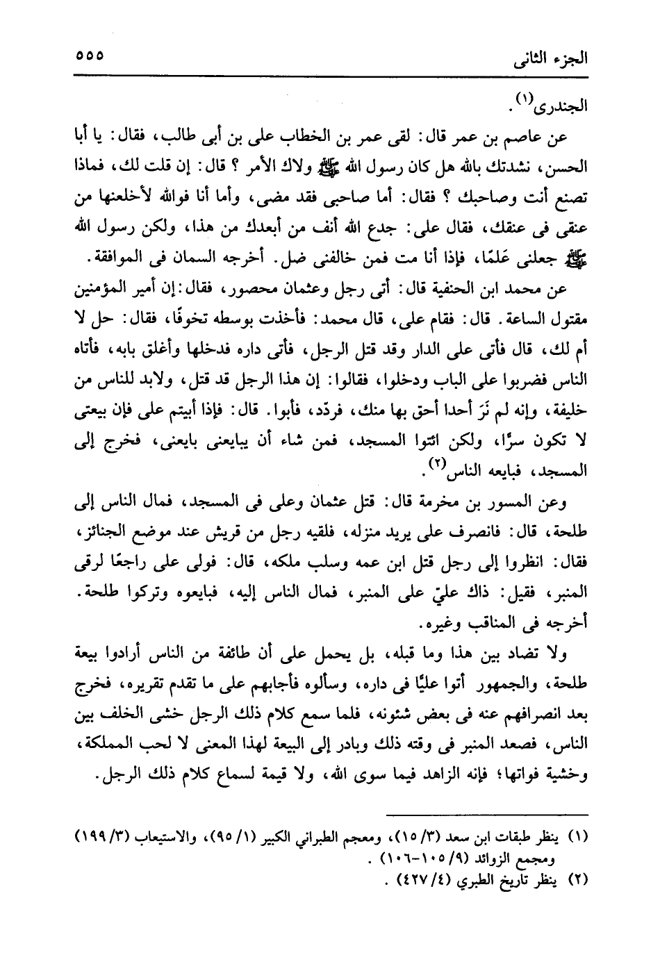 الجندري عَن عَاصِم بن عمر قَالَ لَقِي عمر بن الْخطاب عَليّ بن أبي طَالب فَقَالَ يَا أَبَا الْحسن نشدتك بِاللَّه هَل كَانَ رَسُول الله