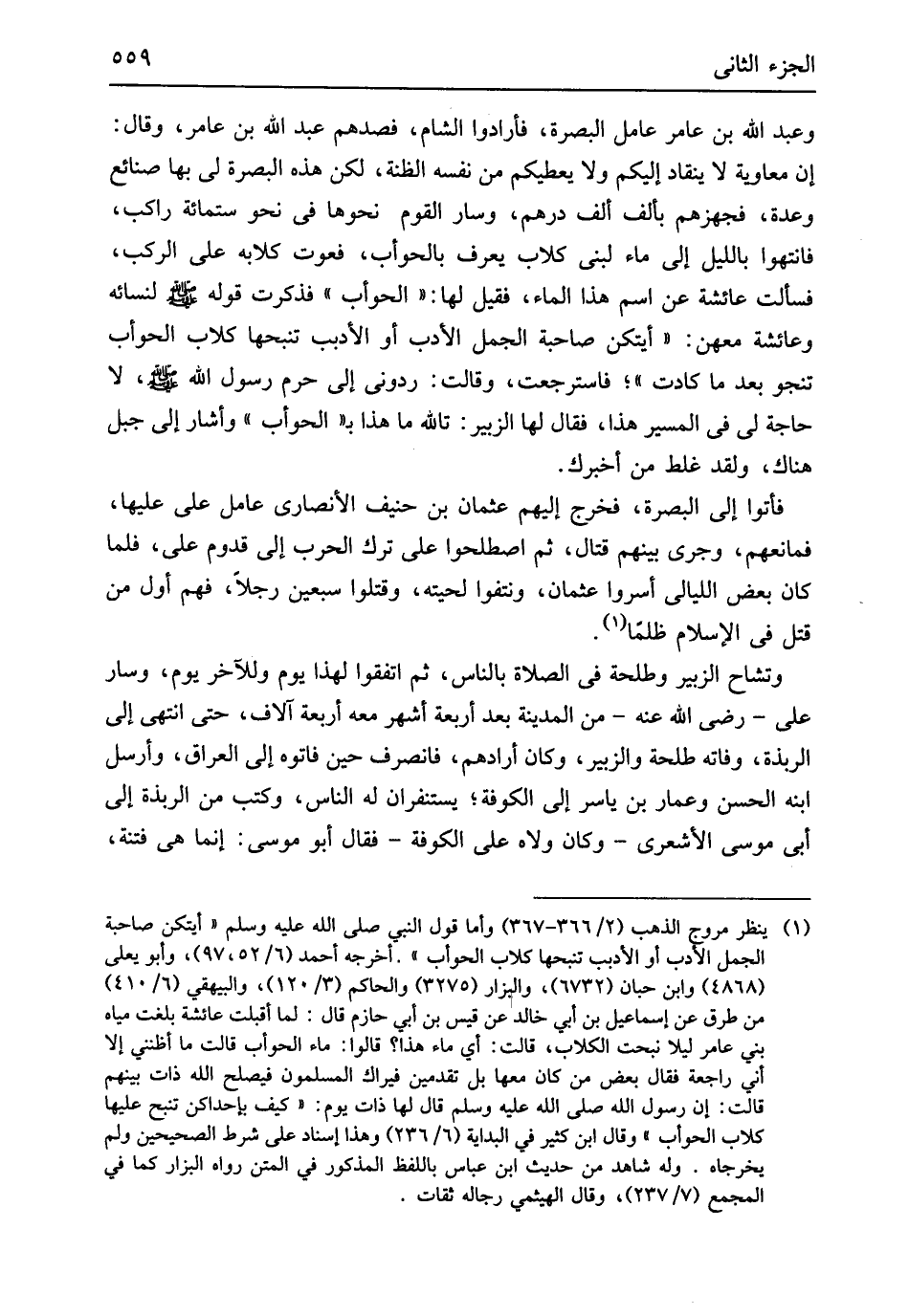 لَا حَاجَة لي فِي الْمسير هَذَا فَقَالَ لَهَا الزبير تالله مَا هَذَا بالحوأب وَأَشَارَ إِلَى جبل هُنَاكَ وَلَقَد غلط من أخْبرك فَأتوا إِلَى الْبَصْرَة فَخرج إِلَيْهِم عُثْمَان بن حنيف الْأنْصَارِيّ عَامل على عَلَيْهَا فمانعهم وَجرى بَينهم قتال ثمَّ اصْطَلحُوا على ترك الْحَرْب إِلَى قدوم عَليّ فَلَمَّا كَانَ بعض اللَّيَالِي أَسرُّوا عُثْمَان ونتفوا لحيته وَقتلُوا سبعين رجلا فهم أول من قتل فِي الْإِسْلَام ظلما وتشاح الزبير وَطَلْحَة فِي الصَّلَاة بِالنَّاسِ ثمَّ اتَّفقُوا لهَذَا يَوْم وَللْآخر يَوْم وَسَار عَليّ رَضِي الله عَنهُ من الْمَدِينَة بعد أَرْبَعَة أشهر مَعَه أَرْبَعَة آلَاف حَتَّى انْتهى إِلَى الربذَة وَفَاته طَلْحَة وَالزُّبَيْر وَكَانَ أَرَادَهُم فَانْصَرف حِين فاتوه إِلَى الْعرَاق وَأرْسل ابْنه الْحسن وعمار بن يَاسر إِلَى الْكُوفَة يستنفران لَهُ النَّاس وَكتب من الربذَة إِلَى أبي مُوسَى الْأَشْعَرِيّ وَكَانَ ولاه على الْكُوفَة فَقَالَ أَبُو مُوسَى إِنَّمَا هِيَ فتْنَة