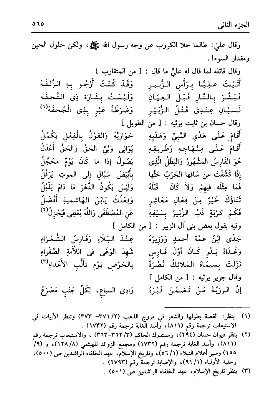 (فَكَمْ كرْبَةٍ ذَبَّ الزُّبَيْرُ بِسَيْفِهِ ... عَنِ المُصْطَفَى وَاللهُ يُعْطِى فَيُجْزِلُ)