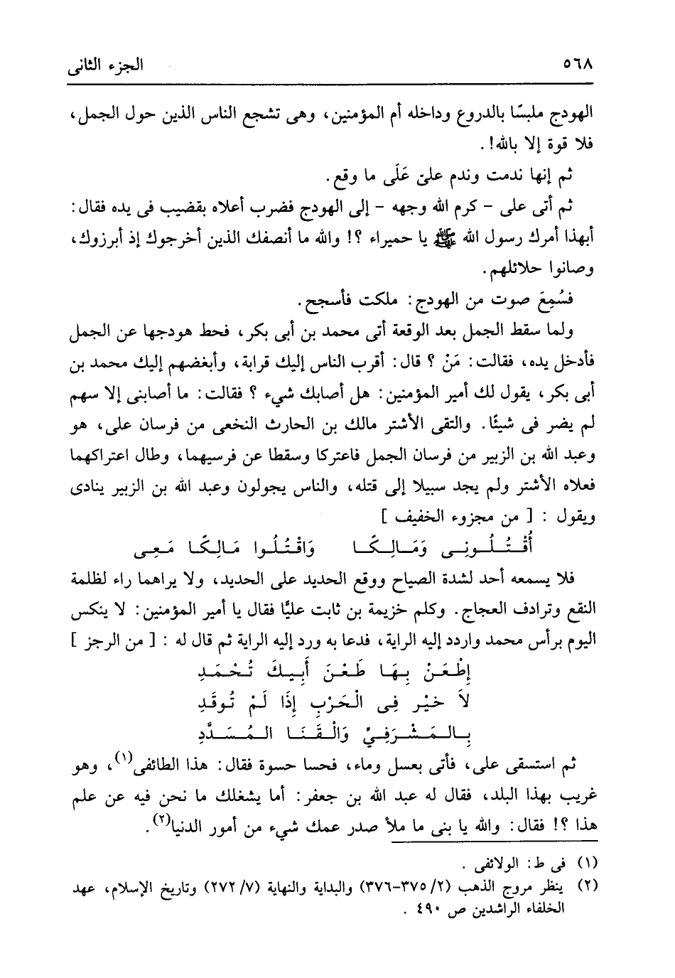 الهودج ملبساً بالدروع وداخله أم الْمُؤمنِينَ وَهِي تشجع النَّاس الَّذين حول الْجمل فَلَا قُوَّة إِلَّا بِاللَّه ثمَّ إِنَّهَا نَدِمت وَنَدم عَليّ عَلَى مَا وَقع ثمَّ أَتَى عَليّ كرم الله وَجهه إِلَى الهودج فَضرب أَعْلَاهُ بقضيب فِي يَده فَقَالَ أَبِهَذَا أَمرك رَسُول الله
