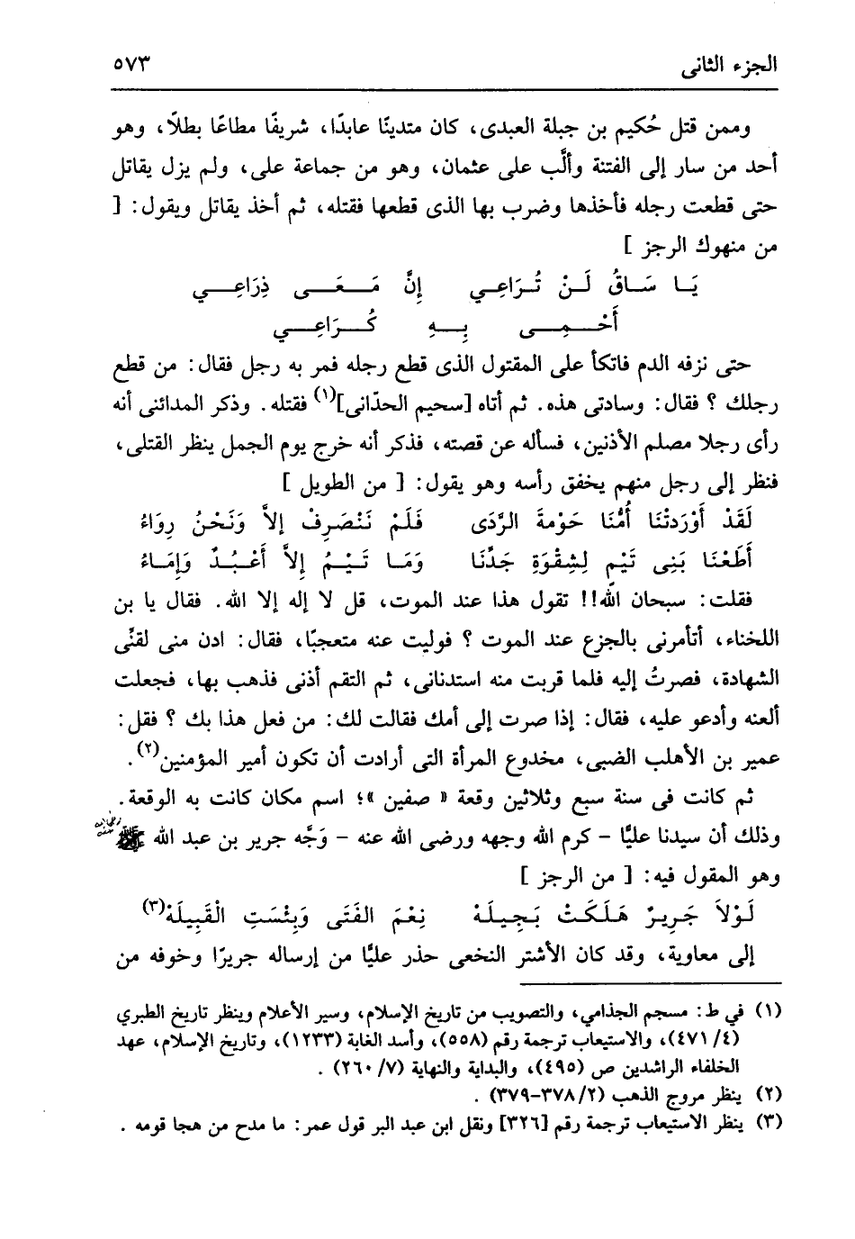 وَمِمَّنْ قتل حُكيم بن جبلة العبدى كَانَ متدينا عابدا وشريفا مُطَاعًا بطلاً وَهُوَ أحد من سَار إِلَى الْفِتْنَة وألب على عُثْمَان وَهُوَ من جمَاعَة عَليّ وَلم يزل يُقَاتل حَتَّى قطعت رجله فَأَخذهَا وَضرب بهَا الَّذِي قطعهَا فَقتله ثمَّ أَخذ يُقَاتل وَهُوَ يَقُول // (من منهوك الرجز) //