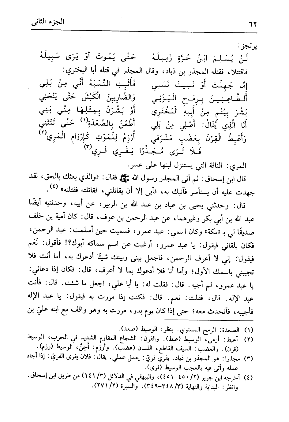 (لَنْ يُسْلِمَ ابْنُ حُرَّةٍ زَمِيلَهْ ... حَتَّى يَمُوتَ أوْ يَرَى سَبِيلَهْ)