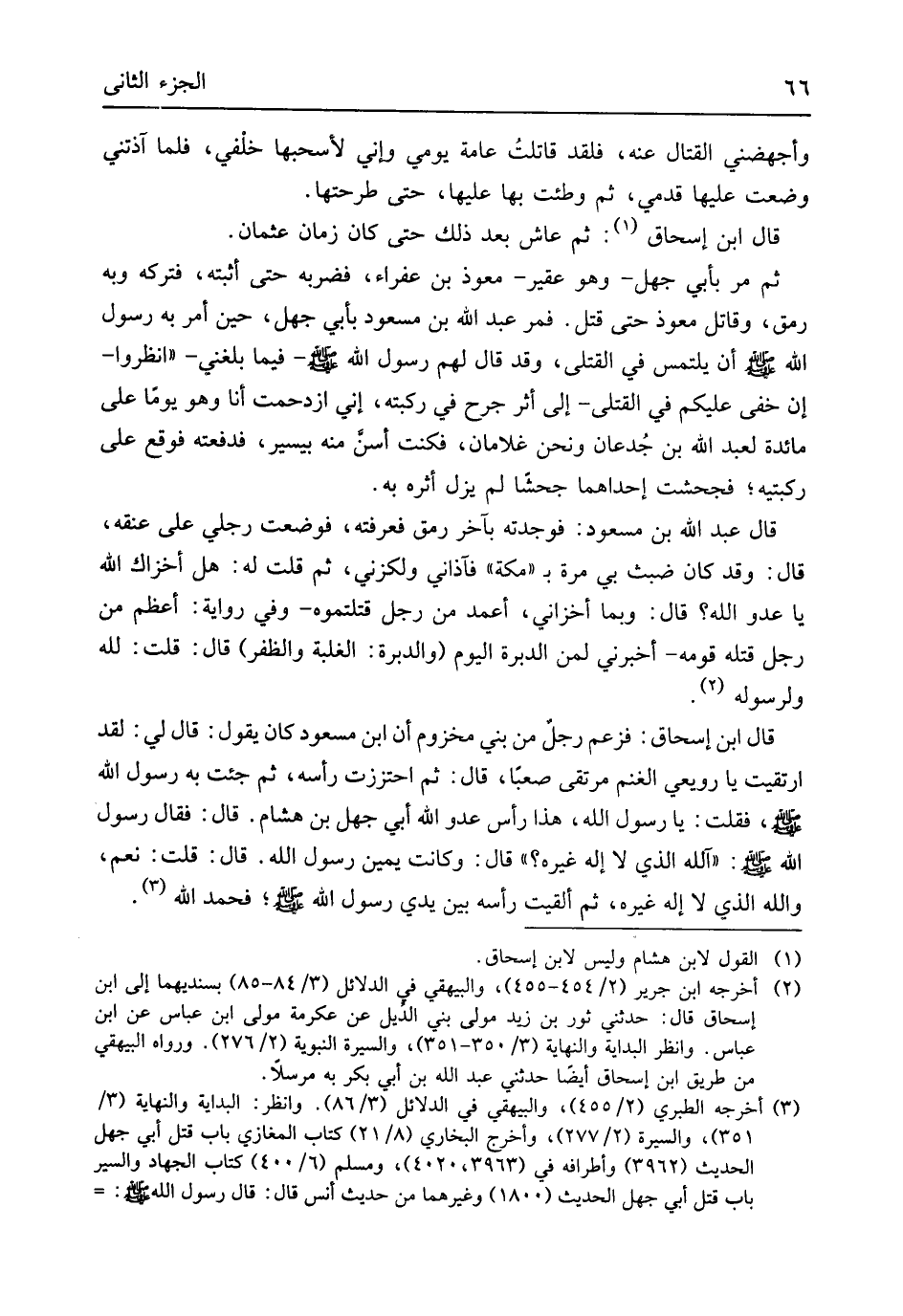 وأجهضني الْقِتَال عَنهُ فَلَقَد قاتلتُ عَامَّة يومي وَإِنِّي لأسحبها خَلْفي فَمَا آذتني وضعت عَلَيْهَا قدمي ثمَّ وطِئت بهَا عَلَيْهَا حَتَّى طرحتها قَالَ ابْن إِسْحَاق ثمَّ عَاشَ بعد ذَلِك حَتَّى كَانَ زمَان عُثْمَان ثمَّ مر بِأبي جهل وَهُوَ عقير معوذ بن عفراء فَضَربهُ حَتَّى أثْبته فَتَركه وَبِه رَمق وَقَاتل معوذ حَتَّى قتل فَمر عبد الله بن مَسْعُود بِأبي جهل حِين أَمر بِهِ رَسُول الله