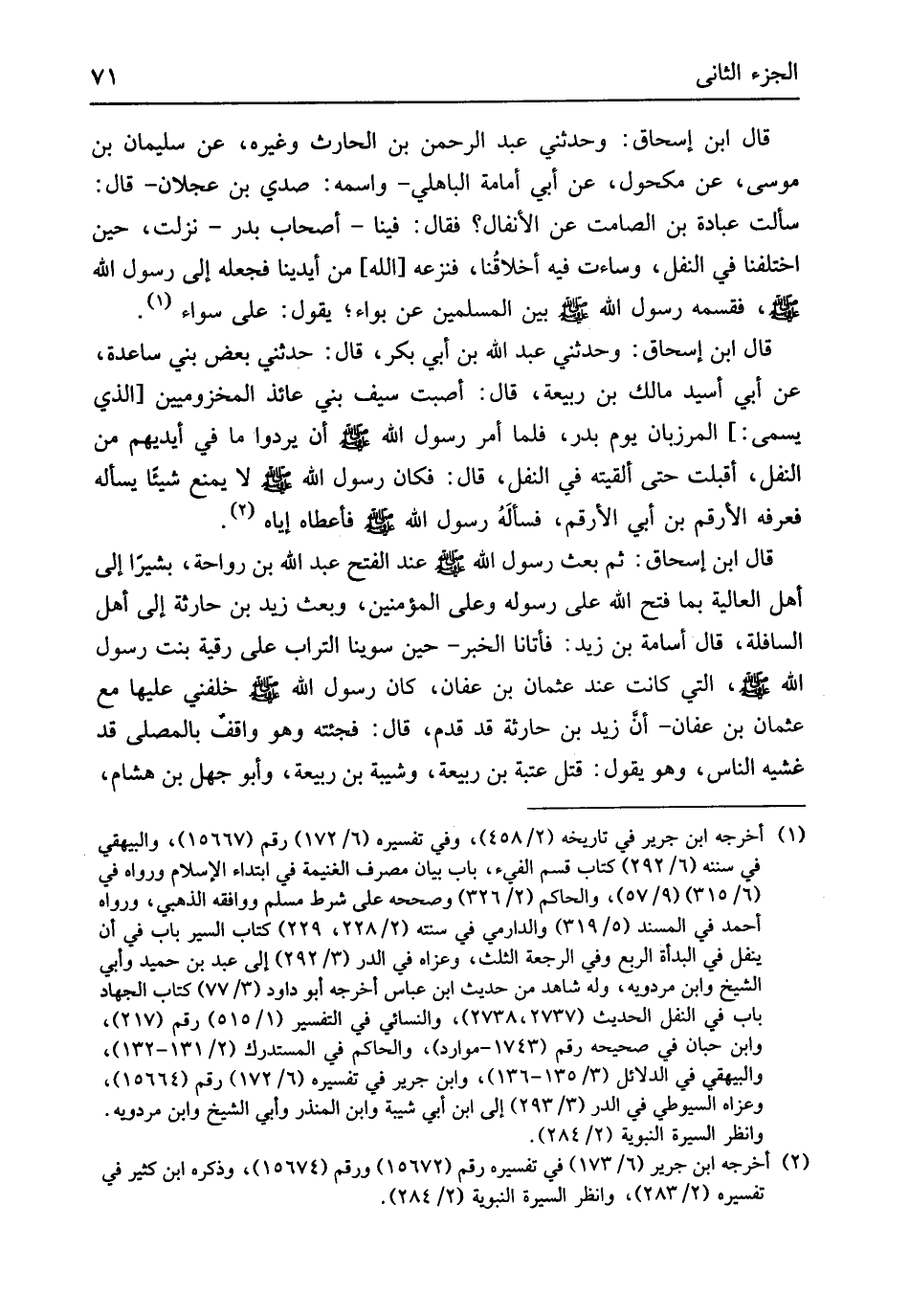 قَالَ ابْن إِسْحَاق وحَدثني عبد الرَّحْمَن بن الْحَارِث وَغَيره عَن سُلَيْمَان بن مُوسَى عَن مَكْحُول عَن أبي أُمَامَة الْبَاهِلِيّ واسْمه صدي بن عجلَان قَالَ سَأَلت عبَادَة بن الصَّامِت عَن الْأَنْفَال فَقَالَ فِينَا أَصْحَاب بدر نزلت حِين اخْتَلَفْنَا فِي النَّفْل وَسَاءَتْ فِيهِ أخلاقُنا فَنَزَعَهُ الله من أَيْدِينَا فَجعله إِلَى رَسُول الله