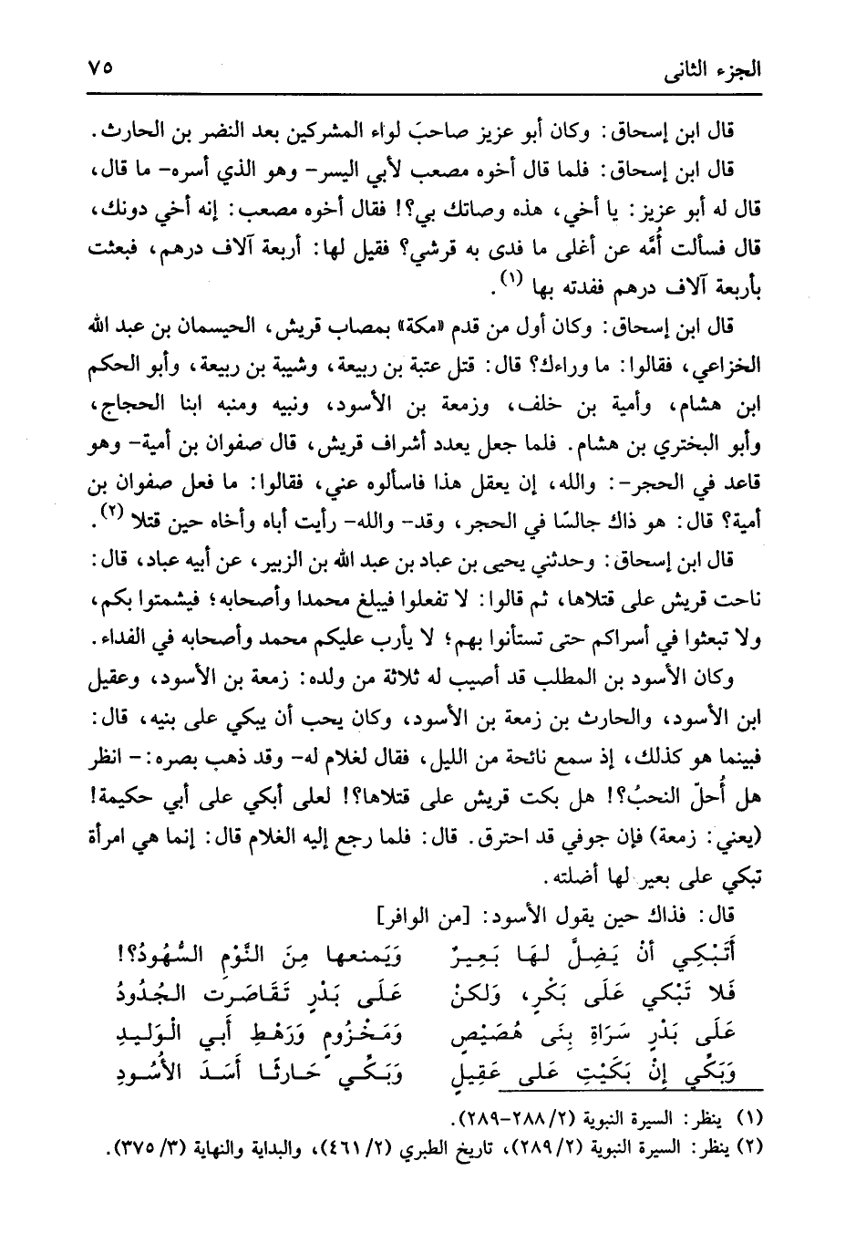 قَالَ ابْن إِسْحَاق وَكَانَ أَبُو عَزِيز صاحبَ لِوَاء الْمُشْركين بعد النَّضر بن الْحَارِث قَالَ ابْن إِسْحَاق فَلَمَّا قَالَ أَخُوهُ مُصعب لأبي الْيُسْر وَهُوَ الَّذِي أسره مَا قَالَ قَالَ لَهُ أَبُو عَزِيز يَا أخي هَذِه وصاتك بِي فَقَالَ أَخُوهُ مُصعب إِنَّه أخي دُونك قَالَ فَسَأَلت أمه عَن أغْلى مَا فدى بِهِ قرشي فَقيل لَهَا أَرْبَعَة آلَاف دِرْهَم فَبعثت بأَرْبعَة آلَاف دِرْهَم ففدته بهَا قَالَ ابْن إِسْحَاق وَكَانَ أول من قدم مَكَّة بمصاب قُرَيْش الحيسمان بن عبد الله الْخُزَاعِيّ فَقَالُوا مَا وَرَاءَك قَالَ قتل عتبَة بن ربيعَة وَشَيْبَة بن ربيعَة وَأَبُو الحكم ابْن هِشَام وَأُميَّة بن خلف وَزَمعَة بن الْأسود وَنبيه ومنبه ابْنا الْحجَّاج وَأَبُو البخْترِي بن هِشَام فَلَمَّا جعل يعدد أَشْرَاف قُرَيْش قَالَ صَفْوَان بن أُميَّة وَهُوَ قَاعد فِي الْحجر وَالله إِن يعقل هَذَا فَاسْأَلُوهُ عني فَقَالُوا مَا فعل صَفْوَان بن أُميَّة قَالَ هُوَ ذَاك جَالِسا فِي الْحجر وَقد وَالله رَأَيْت أَبَاهُ وأخاه حِين قتلا قَالَ ابْن إِسْحَاق وحَدثني يحيى بن عباد بن عبد الله بن الزبير عَن أَبِيه عباد قَالَ ناحت قُرَيْش على قتلاها ثمَّ قَالُوا لَا تَفعلُوا فَيبلغ مُحَمَّدًا وَأَصْحَابه فيشمتوا بكم وَلَا تبعثوا فِي أَسْرَاكُم حَتَّى تستأنوا بهم لَا يأرب عَلَيْكُم مُحَمَّد وَأَصْحَابه فِي الْفِدَاء وَكَانَ الْأسود بن الْمطلب قد أُصِيب لَهُ ثَلَاثَة من وَلَده زَمعَة بن الْأسود وَعقيل ابْن الْأسود والْحَارث بن زَمعَة بن الْأسود وَكَانَ يجب أَن يبكي على بنيه قَالَ فَبَيْنَمَا هُوَ كَذَلِك إِذْ سمع نائحة من اللَّيْل فَقَالَ لغلام لَهُ وَقد ذهب بَصَره انْظُر هَل أُحل النحب هَل بَكت قُرَيْش على قتلاها لعَلي أبْكِي علْى أبي حكيمة يَعْنِي زَمعَة فَإِن جوفي قد احْتَرَقَ قَالَ فَلَمَّا رَجَعَ إِلَيْهِ الْغُلَام قَالَ إِنَّمَا هِيَ امْرَأَة تبْكي على بعير لَهَا أضلته قَالَ فَذَاك حِين يَقُول الْأسود // (من الوافر) //