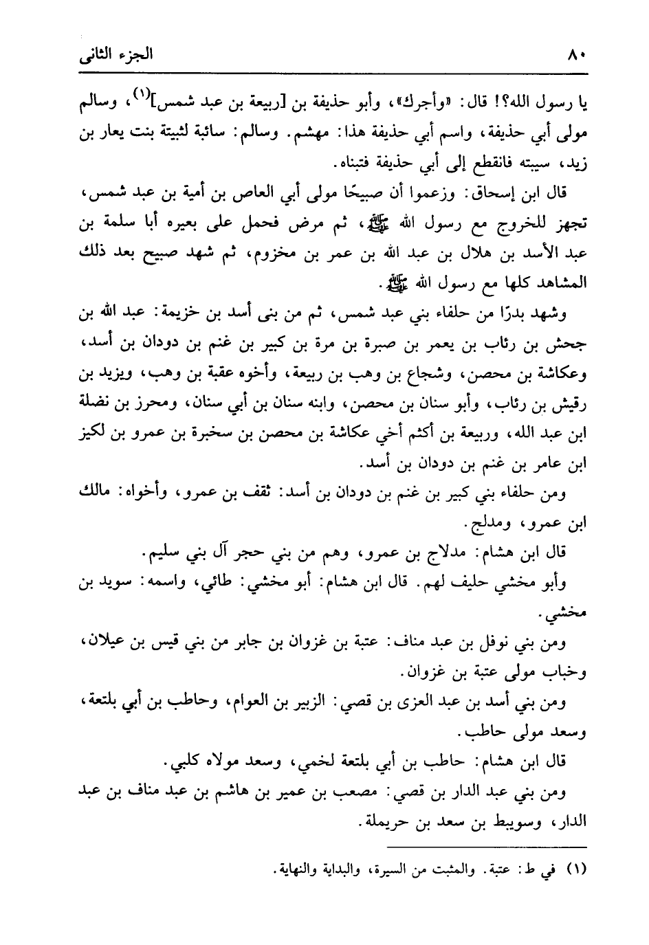 وَشهد بَدْرًا من حلفاء بني عبد شمس ثمَّ من بني أَسد بن خُزَيْمَة عبد الله بن جحش بن رِئَاب بن يعمر بن صبرَة بن مرّة بن كَبِير بن غنم بن دودان بن أَسد وعكاشة بن مُحصن وشجاع بن وهب بن ربيعَة وَأَخُوهُ عقبَة بن وهب وَيزِيد بن رُقَيْش بن رِئَاب وَأَبُو سِنَان بن مُحصن وَابْنه سِنَان بن أبي سِنَان ومحرز بن نَضْلَة ابْن عبد الله وَرَبِيعَة بن أَكْثَم أخي عكاشة بن مُحصن بن سَخْبَرَة بن عَمْرو بن لكيز ابْن عَامر بن غنم بن دودان بن أَسد وَمن حلفاء بني كَبِير بن غنم بن دودان بن أَسد ثقف بن عَمْرو وأخواه مَالك ابْن عَمْرو ومدلج قَالَ ابْن هِشَام مدلاج بن عَمْرو وهم من بني حجر آل بني سليم وَأَبُو مخشي حَلِيف لَهُم قَالَ ابْن هِشَام أَبُو مخشي طائي واسْمه سُوَيْد بن مخشي وَمن بني نَوْفَل بن عبد منَاف عتبَة بن غَزوَان بن جَابر من بني قيس بن عيلان وخباب مولى عتبَة بن غَزوَان وَمن بني أَسد بن عبد الْغَزِّي بن قصي الزبير بن الْعَوام وحاطب بن أبي بلتعة وَسعد مولى حَاطِب قَالَ ابْن هِشَام حَاطِب بن أبي بلتعة لخمي وَسعد مَوْلَاهُ كَلْبِي وَمن بني عبد الدَّار بن قصي مُصعب بن عُمَيْر بن هَاشم بن عبد منَاف بن عبد الدَّار وسويبط بن سعد بن حُرَيْمِلَة