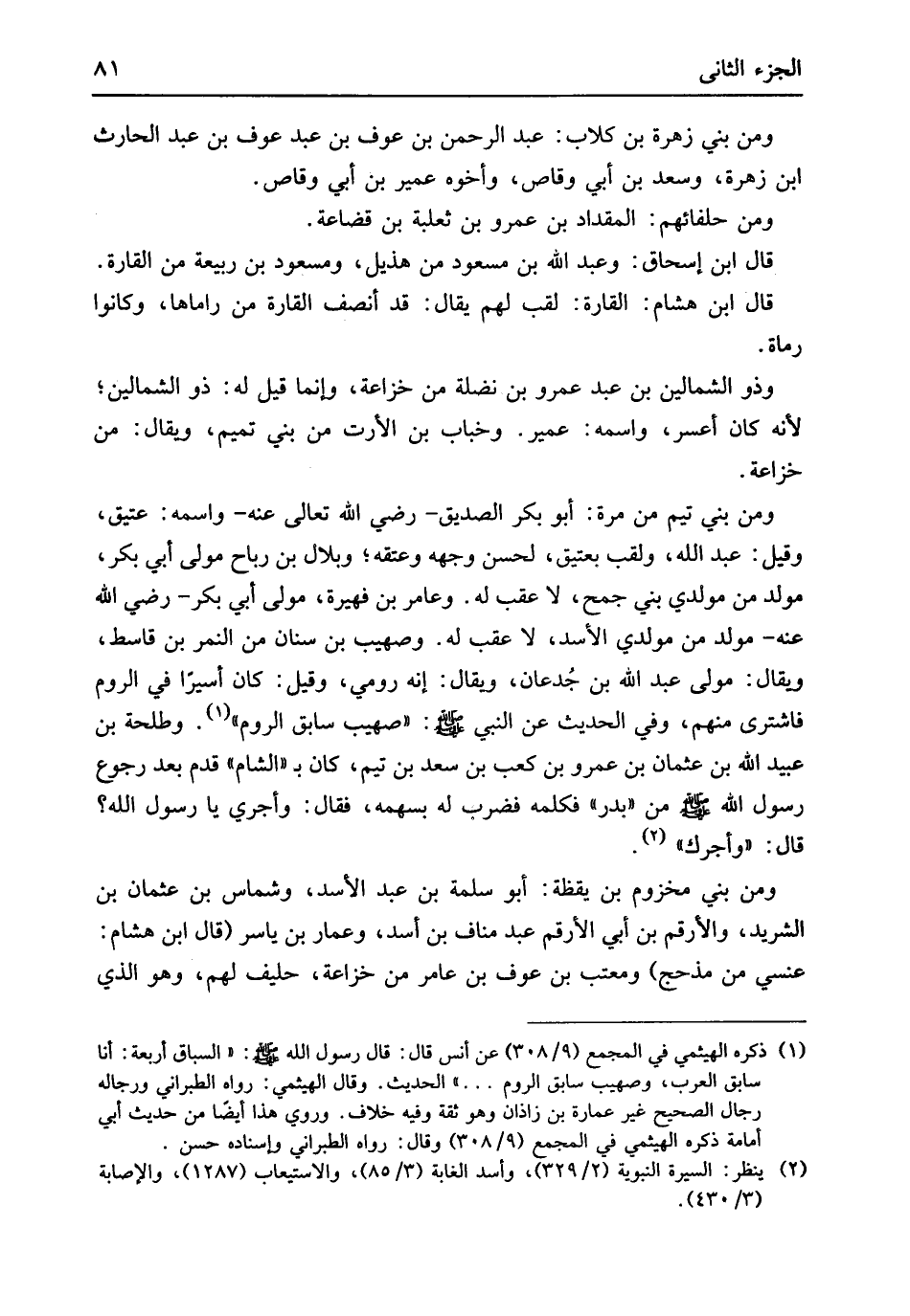وَمن بني زهرَة بن كلاب عبد الرَّحْمَن بن عَوْف بن عبد عَوْف بن عبد الْحَارِث ابْن زهرَة وَسعد بن أبي وَقاص وَأَخُوهُ عُمَيْر بن أبي وَقاص وَمن حلفائهم الْمِقْدَاد بن عَمْرو بن ثَعْلَبَة بن قضاعة قَالَ ابْن إِسْحَاق وَعبد الله بن مَسْعُود من هُذَيْل ومسعود بن ربيعَة من القارة قَالَ ابْن هِشَام القارة لقب لَهُم يُقَال قد أنصف القارة من راماها وَكَانُوا رُمَاة وَذُو الشمالين بن عبد عَمْرو بن نَضْلَة من خُزَاعَة وَإِنَّمَا قيل لَهُ ذُو الشمالين لِأَنَّهُ كَانَ أعْسر واسْمه عُمَيْر وخباب بن الْأَرَت من بني تَمِيم وَيُقَال من خُزَاعَة وَمن بني تيم من مرّة أَبُو بكر الصّديق رَضِي الله تَعَالَى عَنهُ واسْمه عَتيق وَقيل عبد الله ولقب بعتيق لحسن وَجهه وعتقه وبلال بن رَبَاح مولى أبي بكر مولد من مولدِي بني جمح لَا عقب لَهُ وعامر بن فهَيْرَة مولى أبي بكر رَضِي الله عَنهُ مولد من مولدِي الْأسد لَا عقب لَهُ وصهيب بن سِنَان من النمر بن قاسط وَيُقَال مولى عبد الله بن جُدعان وَيُقَال إِنَّه رومي وَقيل كَانَ أَسِيرًا فِي الرّوم فَاشْترى مِنْهُم وَفِي الحَدِيث عَن النَّبِي