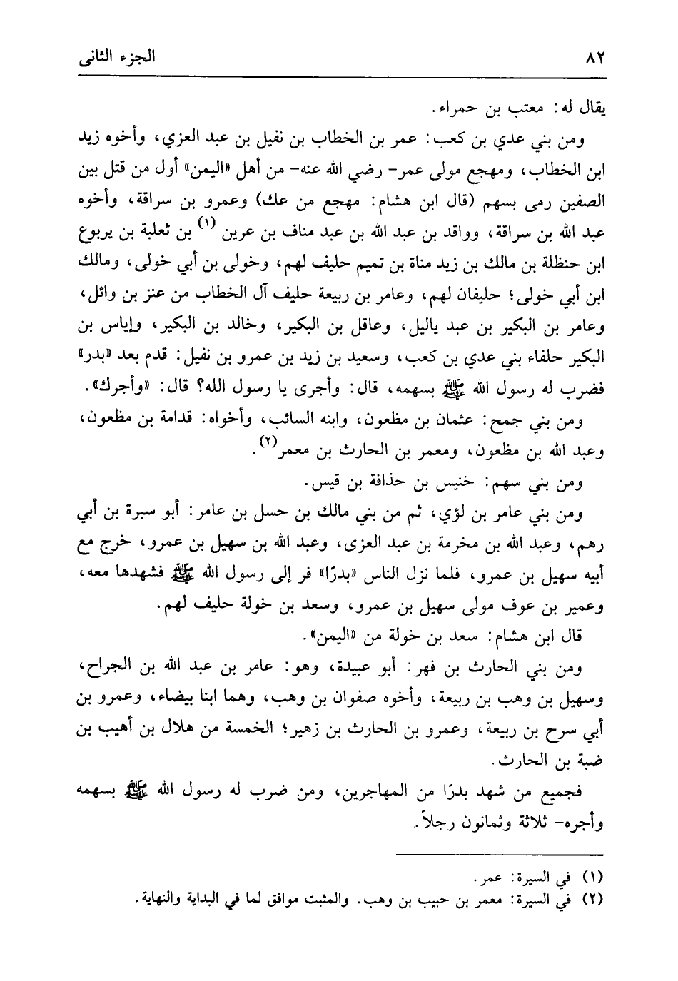 يُقَال لَهُ معتب بن حَمْرَاء وَمن بني عدي بن كَعْب عمر بن الْخطاب بن نفَيْل بن عبد الْعزي وَأَخُوهُ زيد ابْن الْخطاب وَمهجع مولى عمر رَضِي الله عَنهُ من أهل الْيمن أول من قتل بَين الصفين رمى بِسَهْم قَالَ ابْن هِشَام مهجع من عك وَعَمْرو بن سراقَة وَأَخُوهُ عبد الله بن سراقَة وواقد بن عبد الله بن عبد منَاف بن عرين بن ثَعْلَبَة بن يَرْبُوع ابْن حَنْظَلَة بن مَالك بن زيد مَنَاة بن تَمِيم حَلِيف لَهُم وخولى بن أبي خولى وَمَالك ابْن أبي خولى حليفان لَهُم وعامر بن ربيعَة حَلِيف آل الْخطاب من عنز بن وَائِل وعامر بن البكير بن عبد ياليل وعاقل بن البكير وخَالِد بن البكير وَإيَاس بن البكير حلفاء بني عدي بن كَعْب وَسَعِيد بن زيد بن عَمْرو بن نفَيْل قدم بعد بدر فَضرب لَهُ رَسُول الله
