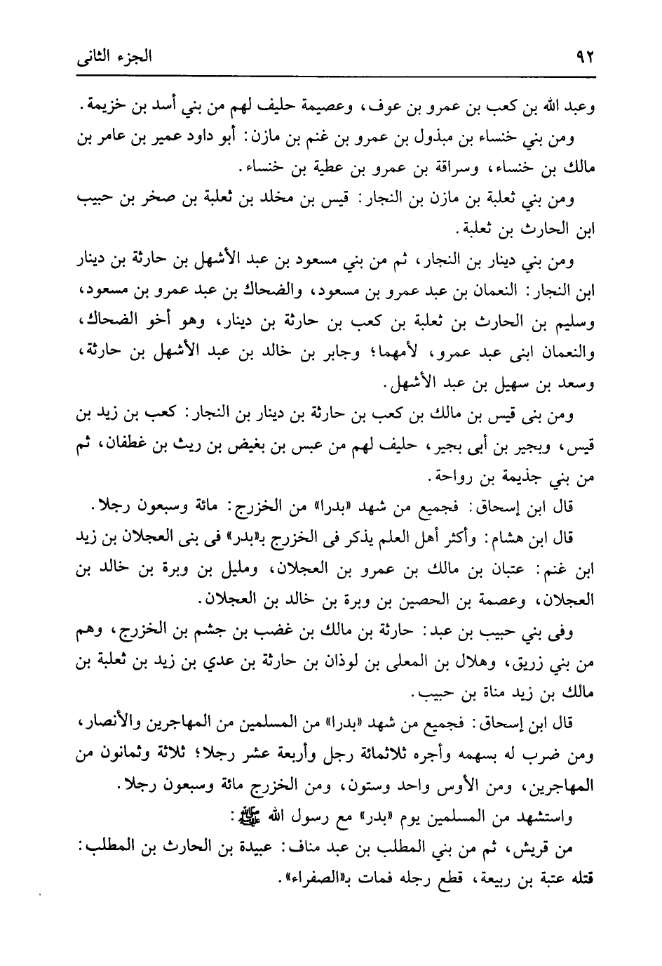 وَعبد الله بن كَعْب بن عَمْرو بن عَوْف وعصيمة حَلِيف لَهُم من بني أَسد بن خُزَيْمَة وَمن بني خنساء بن مبذول بن عَمْرو بن غنم بن مَازِن أَبُو دَاوُد عُمَيْر بن عَامر بن مَالك بن خنساء وسراقة بن عَمْرو بن عَطِيَّة بن خنساء وَمن بني ثَعْلَبَة بن مَازِن بن النجار قيس بن مخلد بن ثَعْلَبَة بن صَخْر بن حبيب ابْن الْحَارِث بن ثَعْلَبَة وَمن بني دِينَار بن النجار ثمَّ من بني مَسْعُود بن عبد الْأَشْهَل بن حَارِثَة بن دِينَار ابْن النجار النُّعْمَان بن عبد عَمْرو بن مَسْعُود وَالضَّحَّاك بن عبد عَمْرو بن مَسْعُود وسليم بن الْحَارِث بن ثَعْلَبَة بن كَعْب بن حَارِثَة بن دِينَار وَهُوَ أَخُو الضَّحَّاك والنعمان ابْني عبد عَمْرو لِأُمِّهِمَا وَجَابِر بن خَالِد بن عبد الْأَشْهَل بن حَارِثَة وَسعد بن سُهَيْل بن عبد الْأَشْهَل وَمن بني قيس بن مَالك بن كَعْب بن حَارِثَة بن دِينَار بن النجار كَعْب بن زيد بن قيس وبجير بن أبي بجير حَلِيف لَهُم من عبس بن بغيض بن ريث بن غطفان ثمَّ من بني جذيمة بن رَوَاحَة قَالَ ابْن إِسْحَاق فَجَمِيع من شهد بَدْرًا من الْخَزْرَج مائَة وَسَبْعُونَ رجلا قَالَ ابْن هِشَام وَأكْثر أهل الْعلم يذكر فِي الْخَزْرَج ببدر فِي بني العجلان بن زيد ابْن غنم عتْبَان بن مَالك بن عَمْرو بن العجلان ومليل بن وبرة بن خَالِد بن العجلان وعصمة بن الْحصين بن وبرة بن خَالِد بن العجلان وَفِي بني حبيب بن عبد حَارِثَة بن مَالك بن غضب بن جشم بن الْخَزْرَج وهم من بني زُرَيْق وهلال بن الْمُعَلَّى بن لوذان بن حَارِثَة بن عدي بن زيد بن ثَعْلَبَة بن مَالك بن زيد مَنَاة بن حبيب قَالَ ابْن إِسْحَاق فَجَمِيع من شهد بَدْرًا من الْمُسلمين من الْمُهَاجِرين وَالْأَنْصَار وَمن ضرب لَهُ بسهمه وأجره ثَلَاثمِائَة رجل وَأَرْبَعَة عشر رجلا ثَلَاثَة وَثَمَانُونَ من الْمُهَاجِرين وَمن الْأَوْس وَاحِد وَسِتُّونَ وَمن الْخَزْرَج مائَة وَسَبْعُونَ رجلا وَاسْتشْهدَ من الْمُسلمين يَوْم بدر مَعَ رَسُول الله