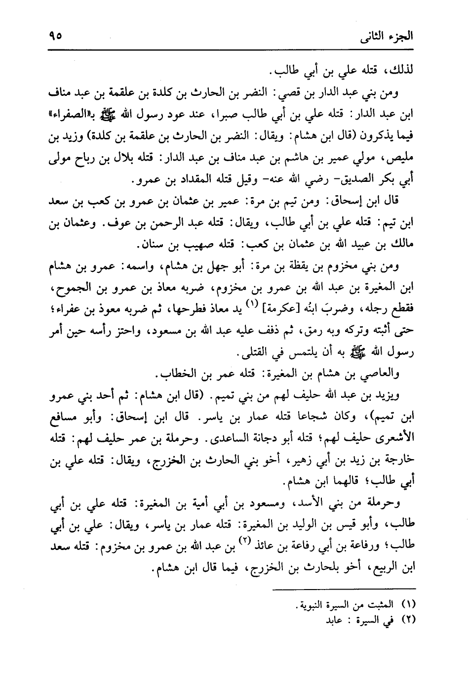 بالصفراء فِيمَا يذكرُونَ قَالَ ابْن هِشَام وَيُقَال النَّضر بن الْحَارِث بن عَلْقَمَة بن كلدة وَزيد بن مليص مولي عُمَيْر بن هَاشم بن عبد منَاف بن عبد الدَّار قَتله بِلَال بن رَبَاح مولى أبي بكر الصّديق رَضِي الله عَنهُ وَقيل قَتله الْمِقْدَاد بن عَمْرو قَالَ ابْن إِسْحَاق وَمن تيم بن مرّة عُمَيْر بن عُثْمَان بن عَمْرو بن كَعْب بن سعد ابْن تيم قَتله عَليّ بن أبي طَالب وَيُقَال قَتله عبد الرَّحْمَن بن عَوْف وَعُثْمَان بن مَالك بن عبيد الله بن عُثْمَان بن كَعْب قَتله صُهَيْب بن سِنَان وَمن بني مَخْزُوم بن يقظة بن مرّة أَبُو جهل بن هِشَام واسْمه عَمْرو بن هِشَام ابْن الْمُغيرَة بن عبد الله بن عَمْرو بن مَخْزُوم ضربه معَاذ بن عَمْرو بن الجموح فَقطع رجله وضربَ ابنُه عِكْرِمَة يَد معَاذ فطرحها ثمَّ ضربه معوذ بن عفراء حَتَّى أثْبته وَتَركه وَبِه رَمق ثمَّ ذفف عَلَيْهِ عبد الله بن مَسْعُود واحتز رَأسه حِين أَمر رَسُول الله