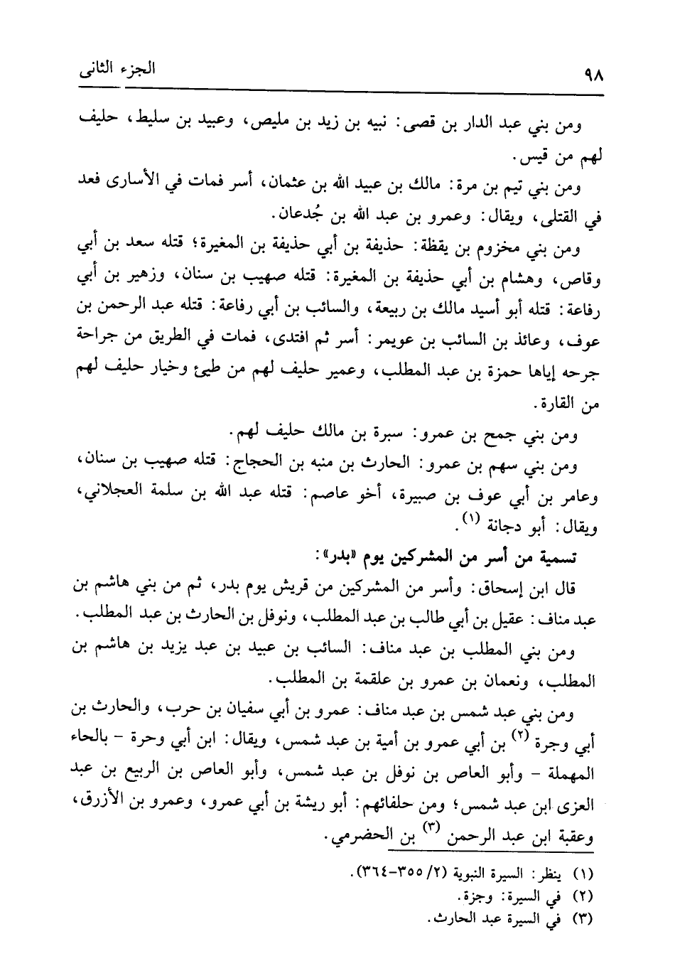 وَمن بني عبد الدَّار بن قصي نبيه بن زيد بن مليص وَعبيد بن سليط حَلِيف لَهُم من قيس وَمن بني تيم بن مرّة مَالك بن عبيد الله بن عُثْمَان أسر فَمَاتَ فِي الْأُسَارَى فعد فِي الْقَتْلَى وَيُقَال وَعَمْرو بن عبد الله بن جُدعان وَمن بني مَخْزُوم بن يقظة حُذَيْفَة بن أبي حُذَيْفَة بن الْمُغيرَة قَتله سعد بن أبي وَقاص وَهِشَام بن أبي حُذَيْفَة بن الْمُغيرَة قَتله صُهَيْب بن سِنَان وَزُهَيْر بن أبي رِفَاعَة قَتله أَبُو أسيد مَالك بن ربيعَة والسائب بن أبي رِفَاعَة قَتله عبد الرَّحْمَن بن عَوْف وعائد بن السَّائِب بن عُوَيْمِر أسر ثمَّ افتدى فَمَاتَ فِي الطَّرِيق من جِرَاحَة جرحه إِيَّاهَا حَمْزَة بن عبد الْمطلب وَعُمَيْر حَلِيف لَهُم من طيىء وَخيَار حَلِيف لَهُم من القارة وَمن بني جمح بن عَمْرو سُبْرَة بن مَالك حَلِيف لَهُم وَمن بني سهم بن عَمْرو الْحَارِث بن مُنَبّه بن الْحجَّاج قَتله صُهَيْب بن سِنَان وعامر بن أبي عَوْف بن صبيرة أَخُو عَاصِم قَتله عبد الله بن سَلمَة الْعجْلَاني وَيُقَال أَبُو دُجَانَة تَسْمِيَة من أسر من الْمُشْركين يَوْم بدر قَالَ ابْن إِسْحَاق وَأسر من الْمُشْركين من قُرَيْش يَوْم بدر ثمَّ من بني هَاشم بن عبد منَاف عقيل بن أبي طَالب بن عبد الْمطلب وَنَوْفَل بن الْحَارِث بن عبد الْمطلب وَمن بني الْمطلب بن عبد منَاف السَّائِب بن عبيد بن عبد يزِيد بن هَاشم بن الْمطلب ونعمان بن عَمْرو بن عَلْقَمَة بن الْمطلب وَمن بني عبد شمس بن عبد منَاف عَمْرو بن أبي سُفْيَان بن حَرْب والْحَارث بن أبي وجرة بن أبي عَمْرو بن أُميَّة بن عبد شمس وَيُقَال ابْن أبي وحرة بِالْحَاء الْمُهْملَة وَأَبُو الْعَاصِ بن نَوْفَل بن عبد شمس وَأَبُو الْعَاصِ بن الرّبيع بن عبد الْعُزَّى ابْن عبد شمس وَمن حلفائهم أَبُو ريشة بن أبي عَمْرو وَعَمْرو بن الْأَزْرَق وَعقبَة ابْن عبد الرَّحْمَن بن الْحَضْرَمِيّ