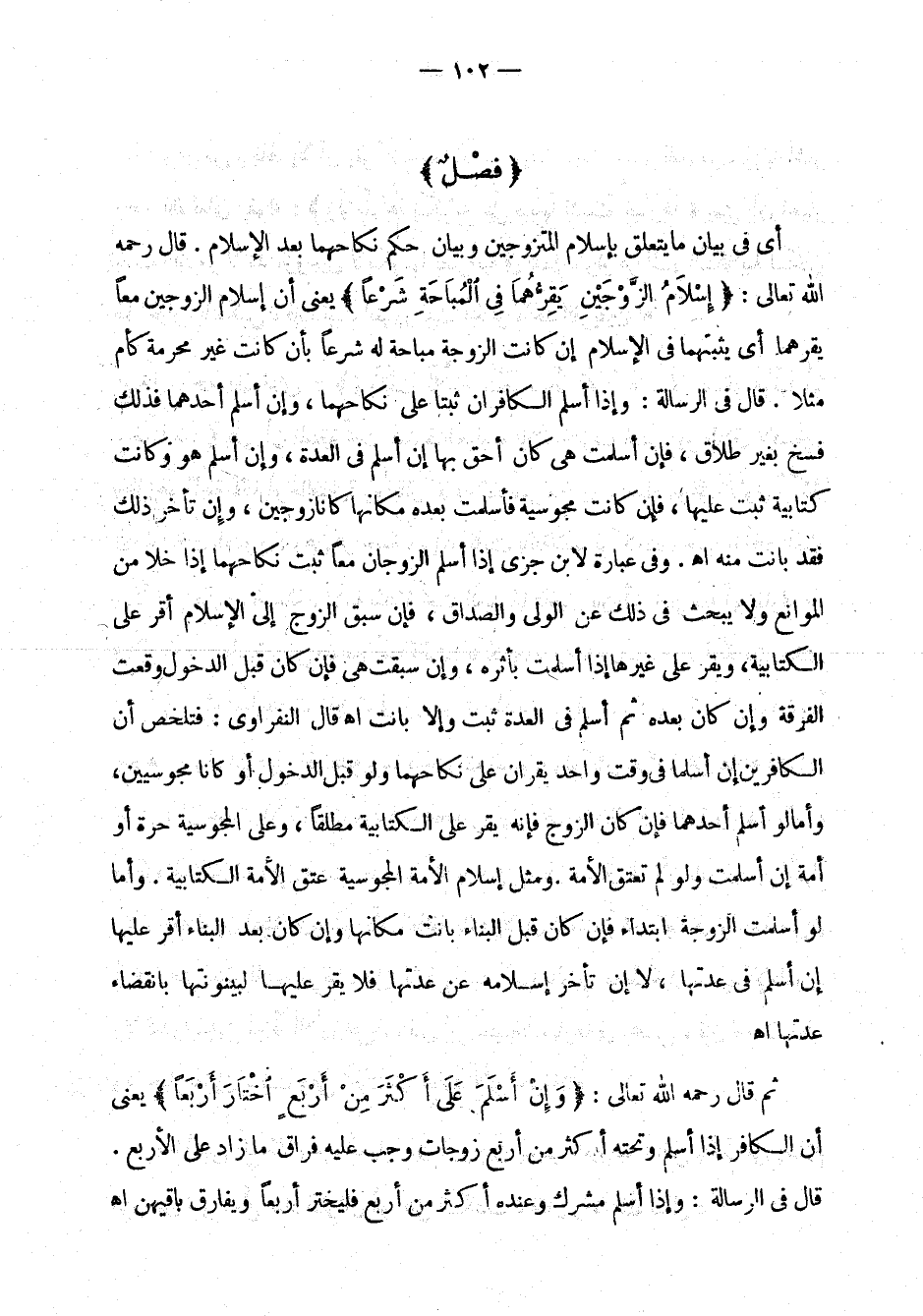أي في بيان ما يتعلق بإسلام المتزوجين وبيان حكم نكاحهما بعد الإسلام. قال رحمه الله تعالى: " إسلام الزوجين يقرهما في المباحة شرعاً " يعني أن إسلام الزوجين معاً يقرهما أي يثبتهما في الإسلام إن كانت الزوجة مباحة له شرعاً بأن كانت غير محرمة كأم مثلاً. قال في الرسالة: وإذا أسلم الكافران ثبتا على نكاحهما، وإن أسلم أحدهما فذلك فسخ بغير طلاق، فإن أسلمت هي كان أحق بها إن أسلم في العدة، وإن أسلم هو وكانت كتابية ثبت عليها، فإن كانت مجوسية فأسلمت بعده مكانها كانا زوجين، وإن تأخر ذلك فقد بانت منه اهـ. وفي عبارة لابن جزي إذا أسلم الزوجان معاً ثبت نكاحهما إذا خلا من الموانع الشرعية ولا يبحث في ذلك عن الولي والصداق، فإن سبق الزوج إلى الإسلام أقر على الكتابية، ويقر على غيرها إذا أسلمت بأثره، وإن سبقت هي فإن كان قبل الدخول وقعت الفرقة وإن كان بعده ثم أسلم في العدة ثبت وإلا بانت اهـ قال النفراوي: فتلخص أن الكافرين إن أسلما في وقت واحد يقران على نكاحهما ولو قبل الدخول أو كانا مجوسيين، وأما لو أسلم أحدهما فإن كان الزوج فإنه يقر على الكتابية مطلقاً، وعلى المجوسية حرة أو أمة إن أسلمت ولو لم تعتق الأمة. ومثل إسلام الأمة المجوسية عتق الأمة الكتابية. وأما لو أسلمت الزوجة ابتداء فإن كان قبل البناء بانت مكانها وإن كان بعد البناء أقر عليها إن أسلم في عدتها، لا إن تأخر إسلامه عن عدتها فلا يقر عليها لبينونتها بانقضاء عدتها اهـ.