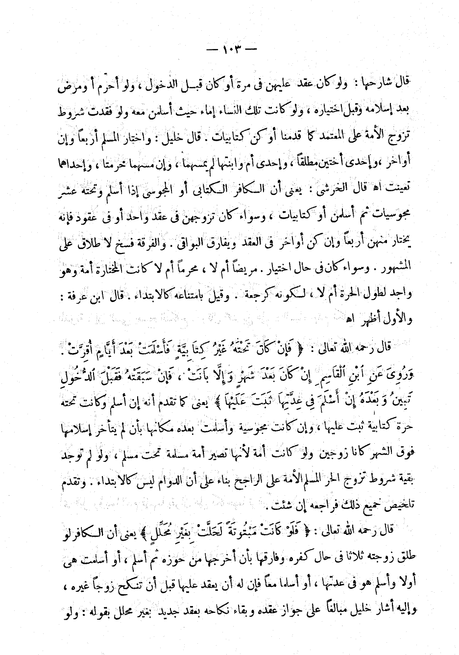 وابنتها لم يمسهما، وإن مسهما حرمتا، وإحداهما تعينت اهـ قال الخرشي: يعني أن الكافر الكتابي أو المجوسي إذا أسلم وتحته عشر مجوسيات ثم أسلمن أو كتاابيات، وسواء تزوجهن في عقد واحد أو في عقود فإنه يختار منهن أربعاً وإن كن أواخر في العقد ويفارق البواقي. والفرقة فسخ لا طلاق على المشهور. وسواء كان في حال اختيار. مريضاً أو لا، محرماً أو لا كانت المختارة أمة هو واجد لطول الحرة أم لا، لكونه كرجعة. وقيل بامتناعه كالابتداء. قال ابن عرفة: والأول أظهر اهـ.