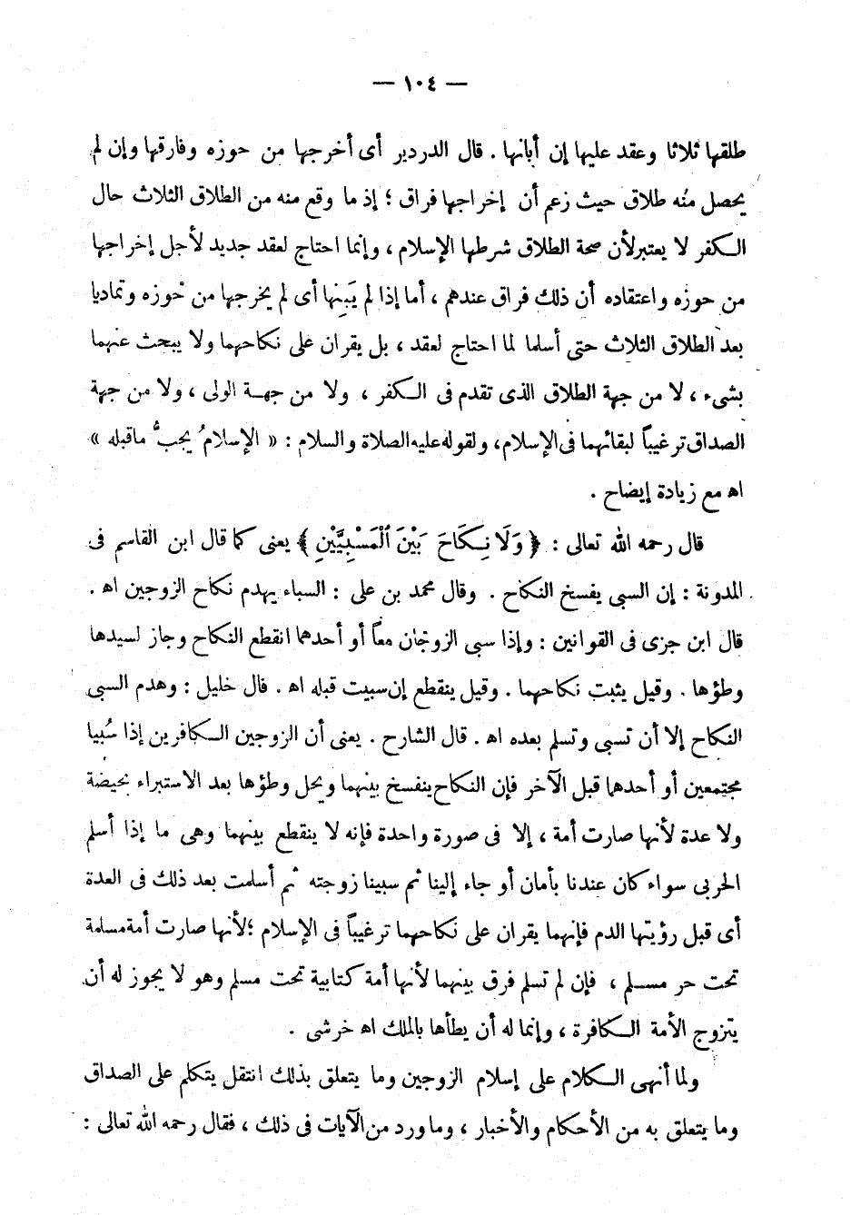 طلقها ثلاثاً وعقد عليها إن أبانها. قال الدردير أي أخرجها من حوزه وفارقها وإن لم يحصل منه طلاق حيث زعم أن إخراجها فراق، إذ ما وقع منه من الطلاق الثلاث حال الكفر لا يعتبر لأن صحة الطلاق شرطها الإسلام، وإنما احتاج لعقد جديد لأجل إخراجها من حوزه واعتقاده أن ذلك فراق عندهم، أما إذا لم يبنها أي لم يخرجها من حوزه وتماديا بعد الطلاق الثلاث حتى أسلما لما احتاج لعقد، بل يقران على نكاحهما ولا يبحث عنهما بشيء، لا من جهة الطلاق الذي تقدم في الكفر، ولا من جهة الولي، ولا من جهة الصداق ترغيباً لبقائهما في الإسلام، ولقوله عليه الصلاة والسلام: " الإسلام يجب ما قبله " اهـ مع زيادة إيضاح