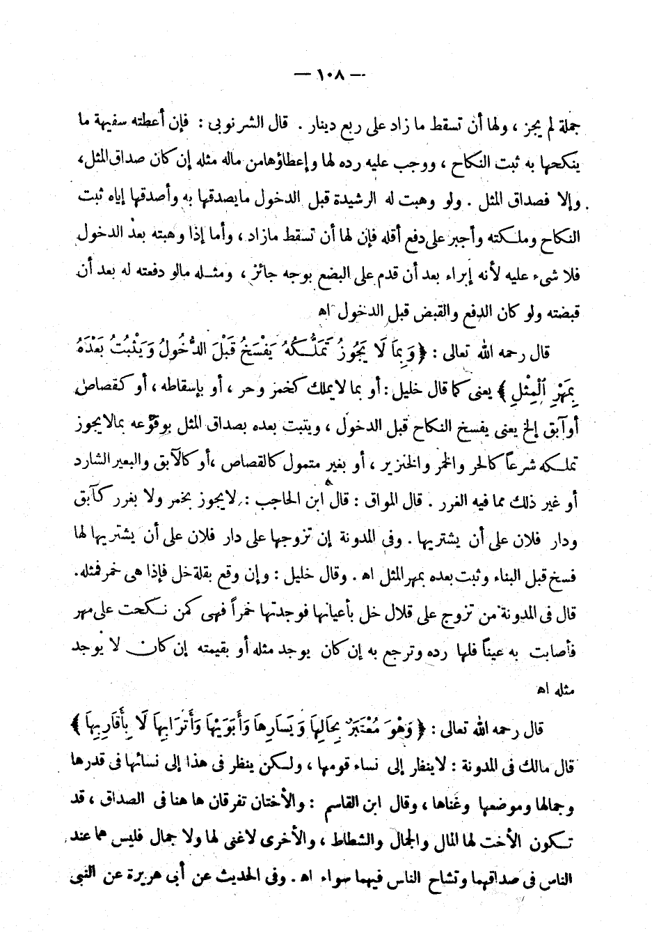 قال رحمه الله تعالى: " وبما لا يجوز تملكه يفسخ قبل الدخول ويثبت بعده بمهر المثل " يعني كما قال خليل: أو بما لا يملك كخمر وحر، أو بإسقاطه، أو كقصاص أو آبق إلخ يعني يفسخ النكاح قبل الدخول، ويثبت بعده بصداق المثل بوقوعه بما لا يجوز تملكه شرعاً كالحر والخمر والخنزير، أو بغير متمول كالقصاص، أو كالآبق والبعير الشارد أو غير ذلك مما فيه الغرر. قال المواق: قال ابن الحاجب: لا يجوز بخمر ولا بغرر كآبق ودار فلان على أن يشتريها. وفي المدونة إن تزوجها على دار فلان على أن يشتريها لها فسخ قبل البناء وثبت بعده