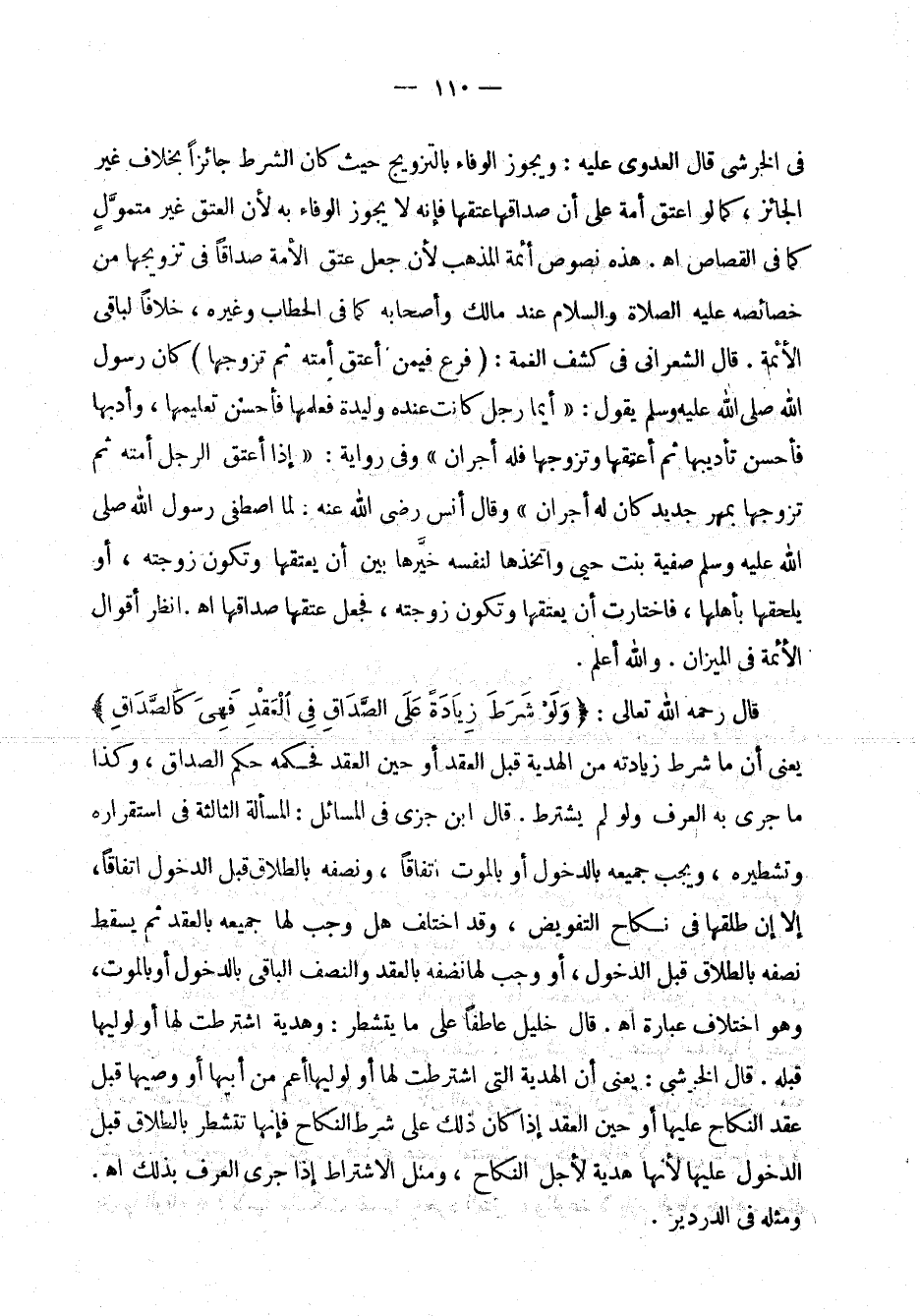 هذه نصوص أئمة المذهب لأن جعل عتق الأمة صداقاً في تزويجها من خصائصه عليه الصلاة والسلام عند مالك وأصحابه كما في الحطاب وغيره، خلافاً لباقي الأئمة. قال الشعراني في كشف الغمة: (فرغ فيمن أعتق أمته ثم تزوجها) كان رسول الله صلى الله عليه وسلم يقول: " أيما رجل كانت عنده وليدة فعلمها فأحسن تعليمها، وأدبها فأحسن تأديبها ثم أعتقها وتزوجها فله أجران " وفي رواية: " إذا أعتق الرجل أمته ثم تزوجها بمهر جديد كان له أجران " وقال أنس، رضي الله عنه: لما اصطفى رسول الله صلى الله عليه وسلم صفية بنت حيي واتخذها لنفسه خيرها بين أن يعتقها وتكون زوجته، أو يلحقها بأهلها، فاختارت أن يعتقها وتكون زوجته، فجعل عتقها صداقها اهـ. انظر أقوال الأئمة في الميزان. والله أعلم.