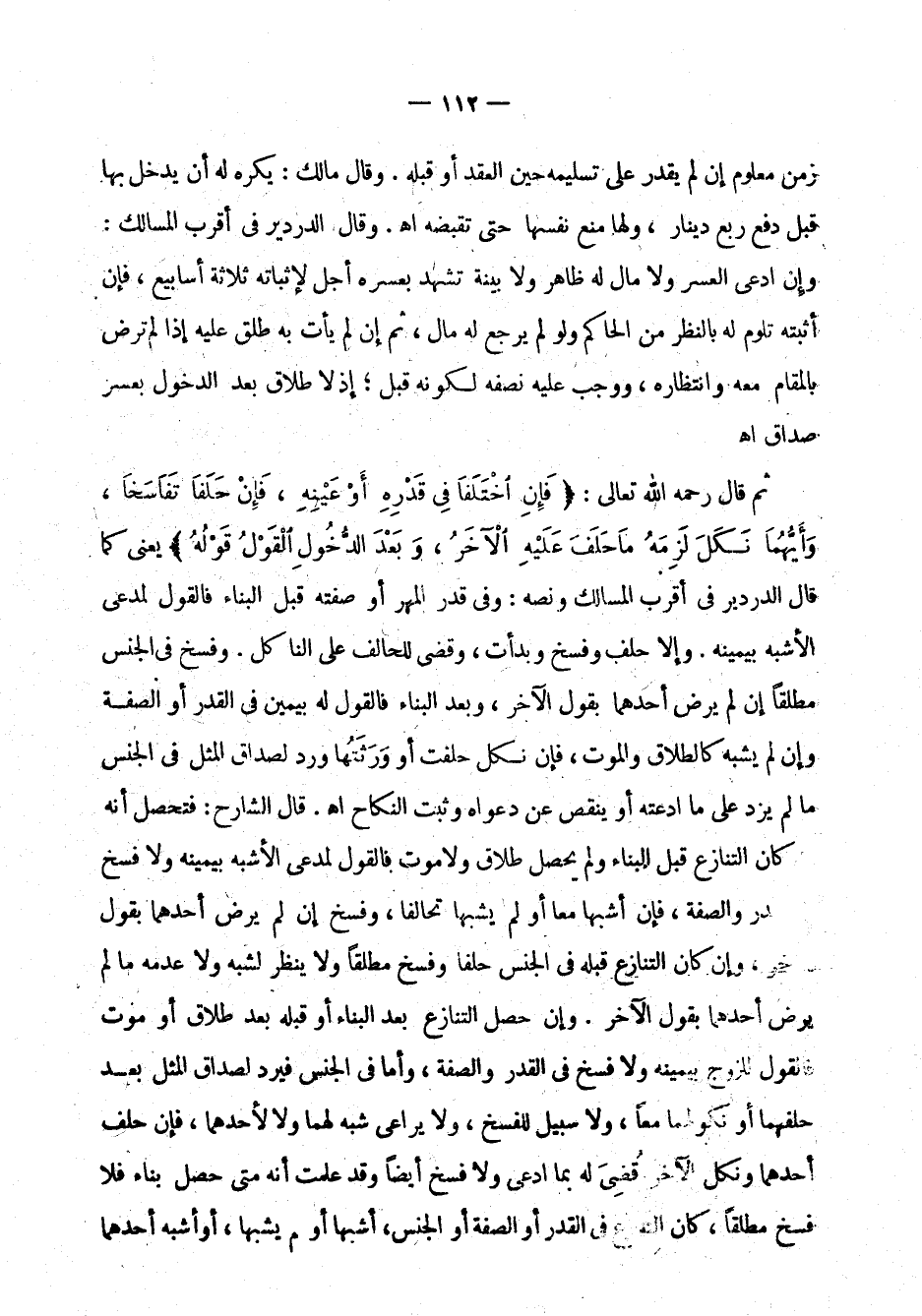 زمن معلوم إن لم يقدر على تسليمه حين العقد أو قبله. وقال مالك: يكره له أن يدخل بها قبل دفع ربع دينار، ولها منع نفسها حتى تقبضه اهـ. وقال الدردير في أقرب المسالك: وإن ادعى العسر ولا مال له ظاهر ولا بينة تشهد بعسره أجل لإثباته ثلاثة أسابيع، فإن أثبته تلوم له بالنظر من الحاكم ولو لم يرجع له مال، ثم إن لم يأت به طلق عليه إذا لم ترض بالمقام معه وانتظاره، ووجب عليه نصفه لكونه قبل؛ إذ لا طلاق بعد الدخول بعسر صداق اهـ.