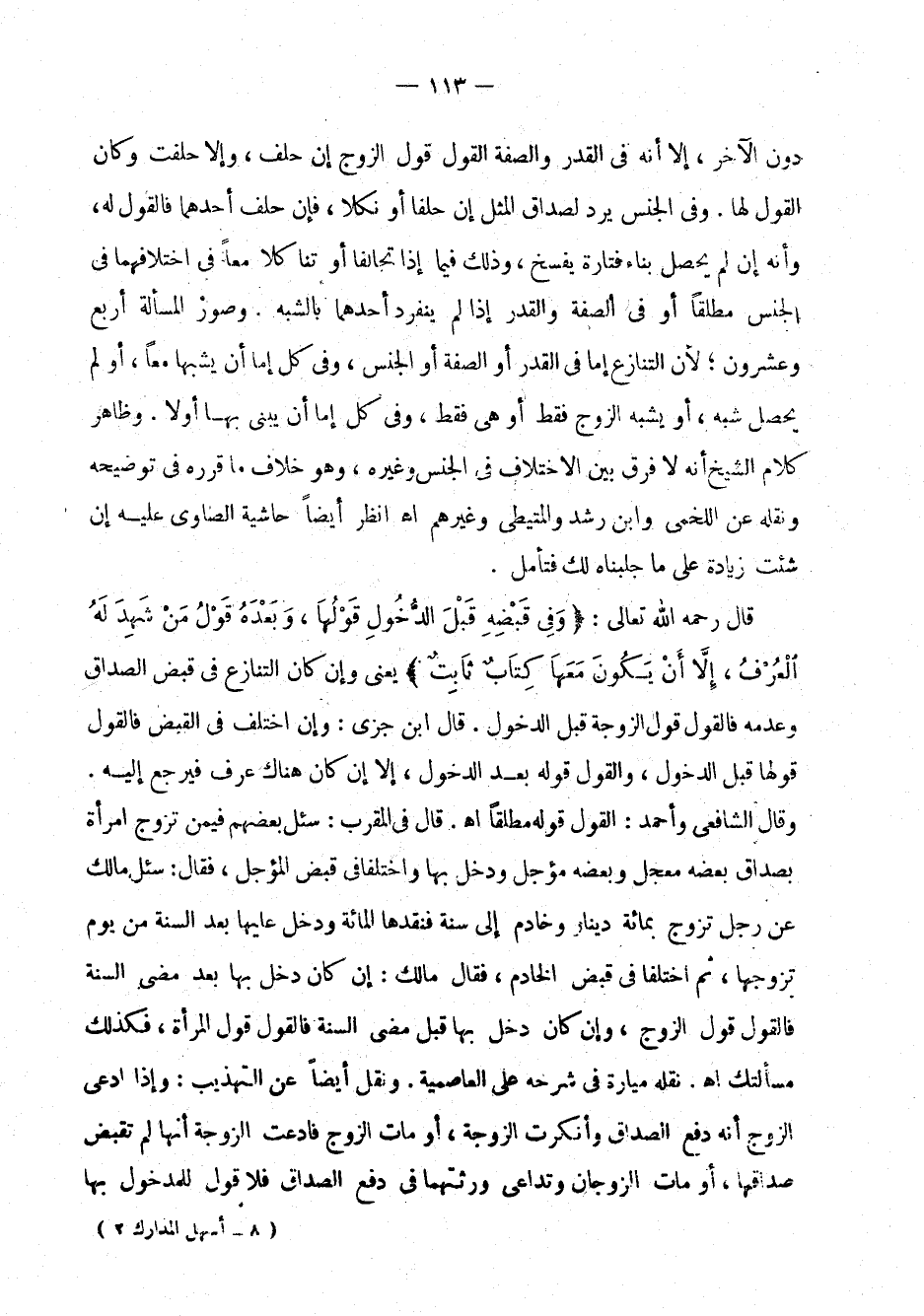 دون الآخر، إلا أنه في القدر والصفة القول قول الزوج إن حلف، وإلا حلفت وكان القول لها. وفي الجنس يرد لصداق المثل إن حلفا أو نكلا، فإن حلف أحدهما فالقول له، وأنه إن لم يحصل بناء فتارة يفسخ، وذلك فيما إذا تحالفا أو تناكلا معاً في اختلافهما في الجنس مطلقاً أو في الصفة والقدر إذا لم ينفرد أحدهما بالشبه. وصور المسألة أربع وعشرون؛ لأن التنازع إما في القدر أو الصفة أو الجنس، وفي كل إما أن يشبها معاً، أو لم يحصل شبه، أو يشبه الزوج فقط أو هي فقط، وفي كل إما أن يبني بها أولاً. وظاهر كلام الشيخ أنه لا فرق بين الاختلاف في الجنس وغيره، وهو خلاف ما قرره في توضيحه ونقله عن اللخمي وابن رشد والمتيطي وغيرهم اهـ انظر أيضاً حاشية الصاوي عليه إن شئت زيادة على ما جلبناه لك فتأمل.