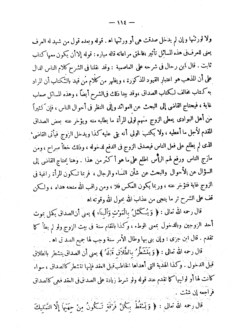 ولا لورثتها وإن لم يدخل صدقت هي أو ورثتها اهـ. قوله: وبعده قول من شهد له العرف يعني للعرف في هذه المسائل تأثير، فالحق مراعاته قاله ميارة: قوله: إلا أن يكون معها كتاب ثابت. قال ابن رحال في شرحه على العاصمية: وقد نقلنا في الشرح كلام الناس الدال على أن المذهب هو اعتبار القيود المذكورة، ويظهر من كلام من قيد بالكتاب أن المراد به كتاب مخالف لكتاب الصداق، وقد بينا ذلك في الشرح أيضاً، وهذه المسائل صعاب غاية، فيحتاج القاضي إلى البحث عن العوائد وإلى النظر في أحوال الناس، فإن كثيراً من أهل البوادي يعطي الزوج منهم لولي المرأة ما يطلبه منه ويؤخر عنه بعض الصداق المقدم لأجل ما أعطيه، ولا يكتب الولي أنه بقي عليه كذا ويدخل الزوج فيأتي القاضي الذي لم يطلع على فعل الناس فيصدق الزوج في الدفع لدخوله، وذلك خطأ صراح، ومن مازج الناس ورفع لهم الرأس اطلع على ما هو أكثر من هذا. وهنا يحتاج القاضي إلى السؤال عن الأحوال والبحث عن شأن النساء والرجال، فربما تكون المرأة راغبة في الزوج غاية فتؤخر عنه، وربما يكون العكس فلا، ومن راقب الله منحه هداه، ولكن قف على الشرح تر ما ينجي من عذاب الله بحول الله وقوته اهـ.
