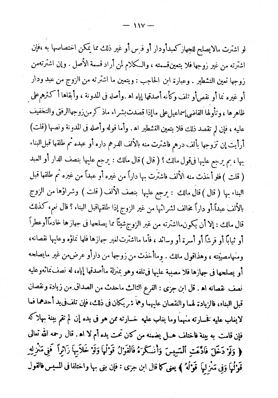 لو اشترت ما لا يصلح للجهاز كعبد أو دار أو فرس أو غير ذلك مما يمكن اختصاصها به، فإن اشترته من غير زوجها فلا يتعين قسمته، والكلام لمن أراد قسمة الأصل. وإن اشترته من زوجها تعين التشطير. وعبارة ابن الحاجب: ويتعين ما اشترته من الزوج من عبد ودار أو غيره نما أو نقص أو تلف وكأنه أصدقها إياه اهـ. وأصله في المدونة، وأبقاها أكثرهم على ظاهرها، وتأولها القاضي إسماعيل على إذا قصدت بشراء ما ذكر من زوجها الرفق والتخفيف عليه، فإن لم تقصد ذلك فلا يتعين التشطير اهـ. وأما قوله: وأصله في المدونة ونصها قلت: أرأيت إن تزوجها بألف درهم فاشترت منه بالألف الدرهم داره أو عبده ثم طلقها قبل البناء بها، بم يرجع عليها في قول مالك؟ قال: قال مالك: يرجع عليها بنصف الدار أو العبد، قلت: فلو أخذت منه الألف فاشترت بها داراً من غيره أو عبداً من غيره ثم طلقها قبل البناء بها قال: قال مالك: يرجع عليها بنصف الألف، قلت: وشراؤها من الزوج بالألف عبداً أو داراً مخالف لشرائها من غير الزوج إذا طلقها قبل البناء؟ قال نعم، كذلك قال مالك: إلا أن يكون ما اشترته من غير الزوج شيئاً مما يصلحها في جهازها خادماً أو عطراً أو ثياباً أو فرشاً أو أسرة أو وسائد، فأما ما اشترت لغير جهازها فلها نماؤه وعليها نقصانه، ومنها مصيبته، وهذا قول مالك: وما أخذت من زوجها من دار أو عرض من غير ما يصلحه أو يصلحها في جهازها فلا مصيبة عليها في تلفه وهو بمنزلة ما أصدقها إياه، له نصف نمائه وعليه نصف نقصانه اهـ. قال ابن جزي: الفرع الثالث ما حدث من الصداق من زيادة ونقصان قبل البناء، فالزيادة لهما والنقصان عليهما وهما شريكان في ذلك، فإن تلف في يد أحدهما فما لا يغاب عليه فخسارته منهما