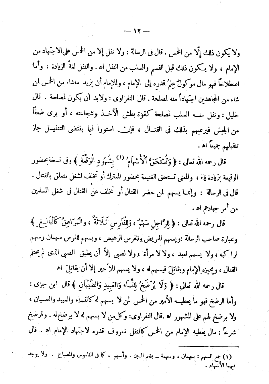 ولا يكون ذلك إلا من الخمس. قال في الرسالة: ولا نفل إلا من الخمس على الاجتهاد من الإمام، ولا يكون ذلك قبل القسم والسلب من النفل اهـ. والنفل لغة الزيادة، وأما اصطلاحاً فهو مال موكول علم قدره إلى الإمام، وللإمام أن يزيد ما شاء من الخمس لمن شاء من المجاهدين اجتهاداً منه لمصلحة.