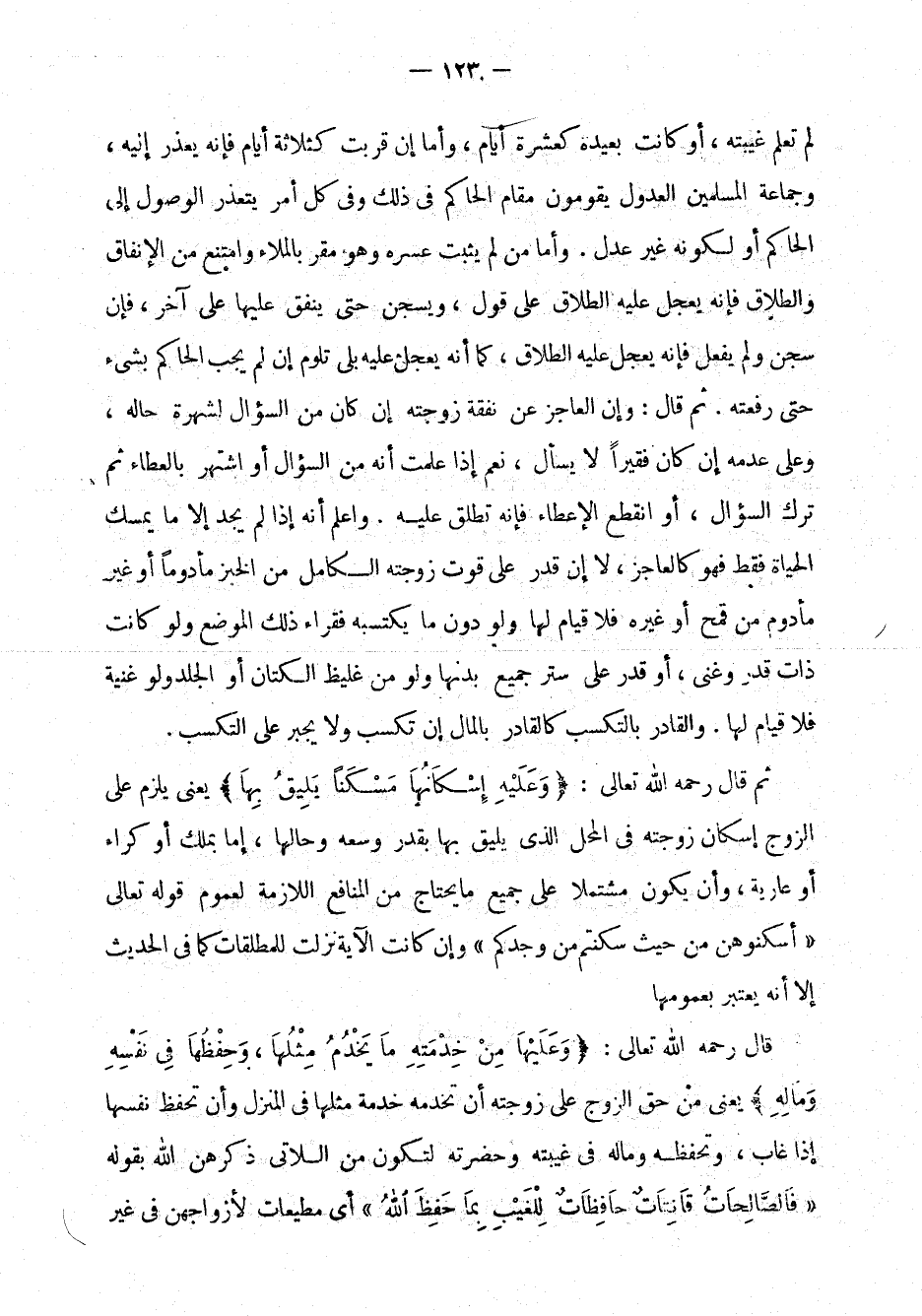 في ذلك وفي كل أمر يتعذر الوصول إلى الحاكم أو لكونه غير عدل. وأما من لم يثبت عسره وهو مقر بالملاء وامتنع من الإنفاق والطلاق فإنه يعجل عليه الطلاق على قول، ويسجن حتى ينفق عليها على آخر، فإن سجن ولم يفعل فإنه يعجل عليه الطلاق، كما أنه يعجل عليه بلا تلوم إن لم يجب الحاكم بشيء حتى رفعته. ثم قال: وإن العاجز عن نفقة زوجته إن كان من السؤال لشهرة حاله، وعلى عدمه إن كان فقيراً لا يسأل، نعم إذا علمت أنه من السؤال أو اشتهر بالعطاء ثم ترك السؤال، أو انقطع الإعطاء فإنه تطلق عليه. واعلم أنه إذا لم يجد إلا ما يمسك الحياة فقط فهو كالعاجز، لا إن قدر على قوت زوجته الكامل من الخبز مأدوماً أو غير مأدوم من قمح أو غيره فلا قيام لها ولو دون ما يكتسبه فقراء ذلك الموضع ولو كانت ذات قدر وغنى، أو قدر على ستر جميع بدنها ولو من غليظ الكتان أو الجلد ولو غنية فلا قيام لها. والقادر بالتكسب كالقادر بالمال إن تكسب ولا يجبر على التكسب.