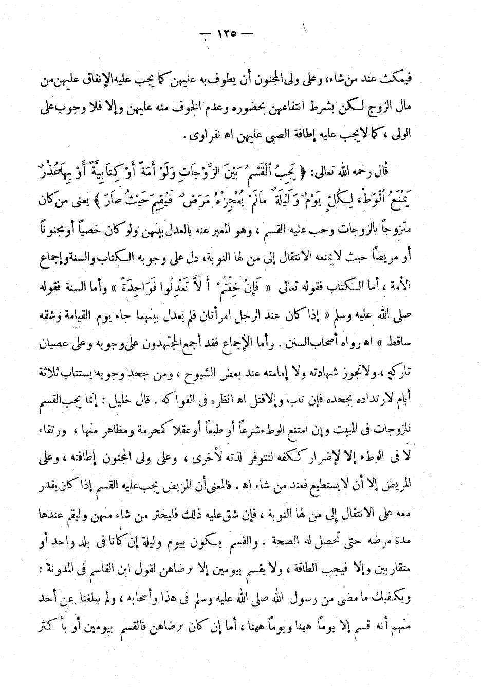 قال رحمه الله تعالى: " يجب القسم بين الزوجات ولو امة أو كتابية أو بها عذر يمنع الوطء لكل يوم وليلة ما لم يعجزه مرض فيقيم حيث صار " يعني من كان متزوجاً بالزوجات وجب عليه القسم، وهو المعبر عنه بالعدل بينهن ولو كان خصياً أو مجنوناً أو مريضاً حيث لا يمنعه الانتقال إلى من لها النوبة، دل على وجوبه الكتاب والسنة وإجماع الأمة، أما الكتاب فقوله تعالى: {فإن خفتم ألا تعدلوا فواحدة} {النساء: 3} وأما السنة فقوله صلى الله عليه وسلم: " إذا كان عند الرجل امرأتان فلم يعدل بينهما جاء يوم القيامة وشقه ساقط " اهـ رواه أصحاب السنن. وأما الإجماع فقد أجمع المجتهدون على وجوبه وعلى عصيان تاركه، ولا تجوز شهادته ولا غمامته عند بعض الشيوخ، ومن جحد وجوبه يستتاب ثلاثة أيام لارتداده بجحده فإن تاب وإلا قتل اهـ أنظره في الفواكه. قال خليل: إنما يجب القسم للزوجات في المبيت وإن امتنع الوطء شرعاً أو طبعاً أو عقلاً كمحرمة ومظاهر منها، ورتقاء لا في الوطء إلا لإضرار ككفه لتتوافر لذته الأخرى، وعلى ولي المجنون إطافته، وعلى المريض إلا أن لا يستطيع فعند من شاء اهـ. فالمعنى أن المريض يجب عليه القسم إذا كان يقدر معه على الانتقال إلى من لها النوبة، فغن شق عليه ذلك فليختر من شاء منهن وليقم عندها مدة مرضه حتى تحصل له الصحة. والقسم يكون بيوم وليلة إن كانا في بلد واحد أو متقاربين وإلا فيجب على الطاقة، ولا يقسم بيومين إلا برضاهن