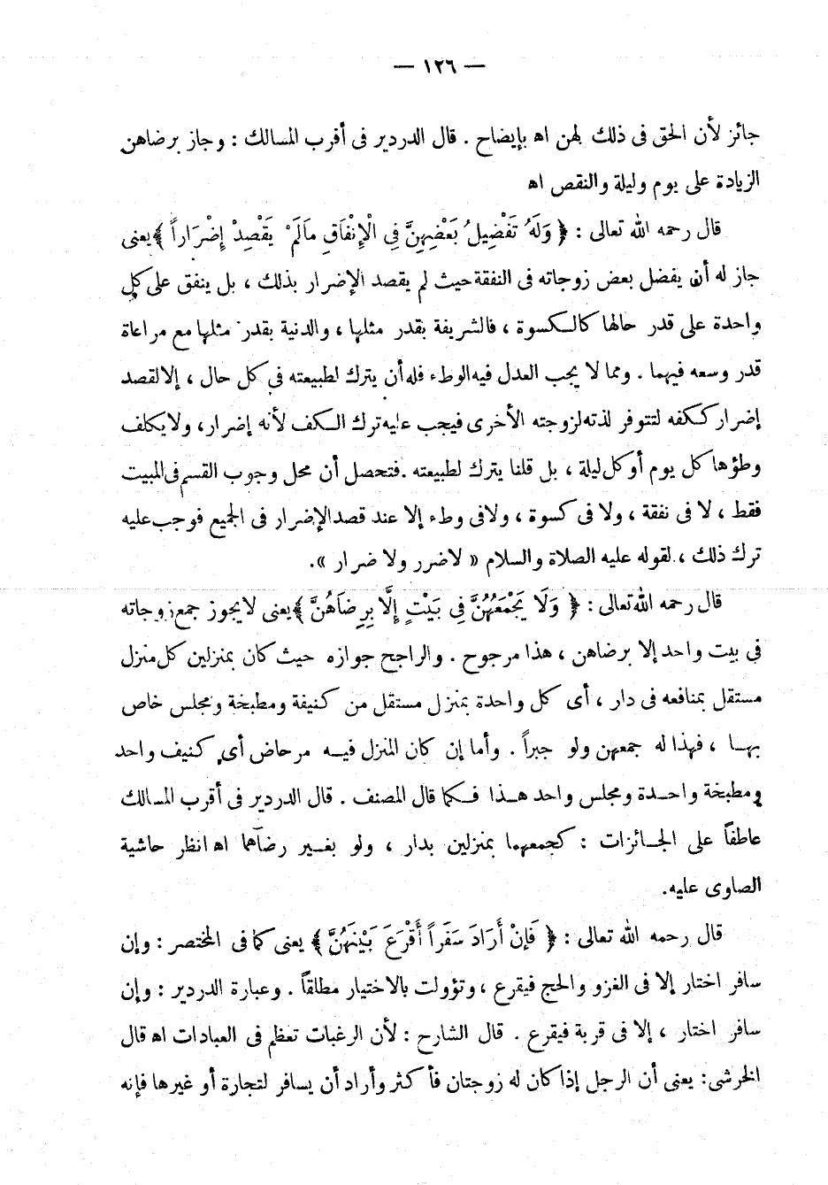 قال رحمه الله تعالى: " وله تفضيل بعضهن في الإنفاق ما لم يقصد إضراراً " يعني جاز له أن يفضل بعض زوجاته في النفقة حيث لم يقصد الإضرار بذلك، بل ينفق على كل واحدة على قدر حالها كالكسوة، فالشريفة بقدر مثلها، والدنية بقدر مثلها مع مراعاة قدر وسعه فيهما، ومما لا يجب العدل فيه الوطء فله أن يترك لطبيعته في كل حال، غلا لقصد إضرار ككفه لتتوافر لذته لزوجته الأخرى فيجب عليه ترك الكف لأنه إضرار، ولا يكف وطؤها كل يوم أو كل ليلة، بل قلنا يترك لطبيعته. فتحصل أن محل وجوب القسم في المبيت فقط، لا في نفقة، ولا في كسوة، ولا في وطء إلا عند قصد الإضرار في الجميع فوجب عليه ترك ذلك، لقوله عليه الصلاة والسلام: " لا ضرر ولا ضرار ".