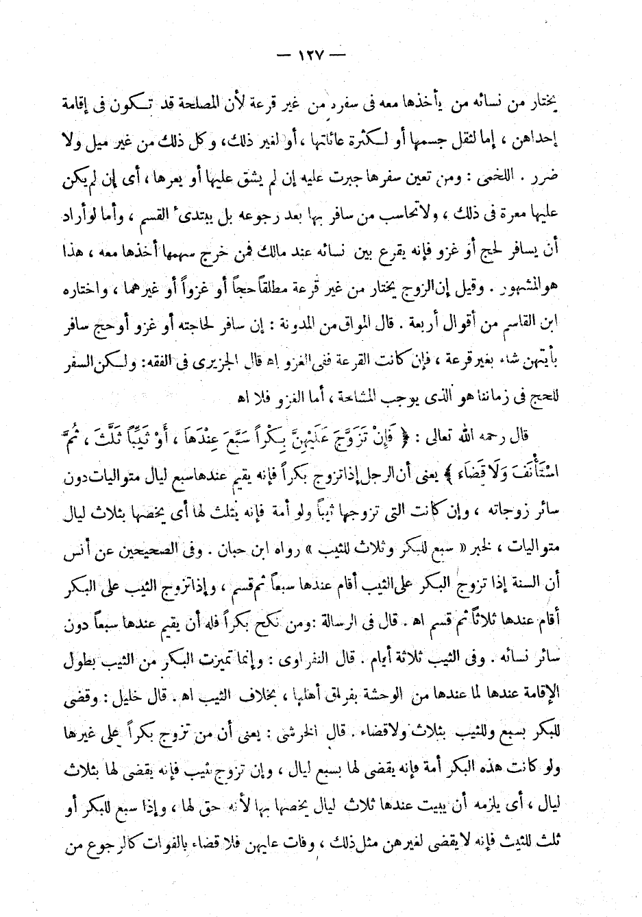 يختار من نسائه من يأخذها معه في سفره من غير قرعة لأن المصلحة قد تكون في إقامة إحداهن. إما لثقل جسمها أو لكثرة عائلتها، أو لغير ذلك، وكل ذلك من غير ميل ولا ضرر. اللخمي: ومن تعين سفرها جبرت عليه إن لم يشق عليها أو يعرها، أي إن لم يكن عليها معرة في ذلك، ولا تحاسب من سافر بها بعد رجوعه بل يبتدئ القسم، وأما لو أراد أن يسافر لحج أو غزو فإنه يقرع بين نسائه عند مالك فمن خرج سهمها أخذها معه، هذا هو المشهور. وقيل