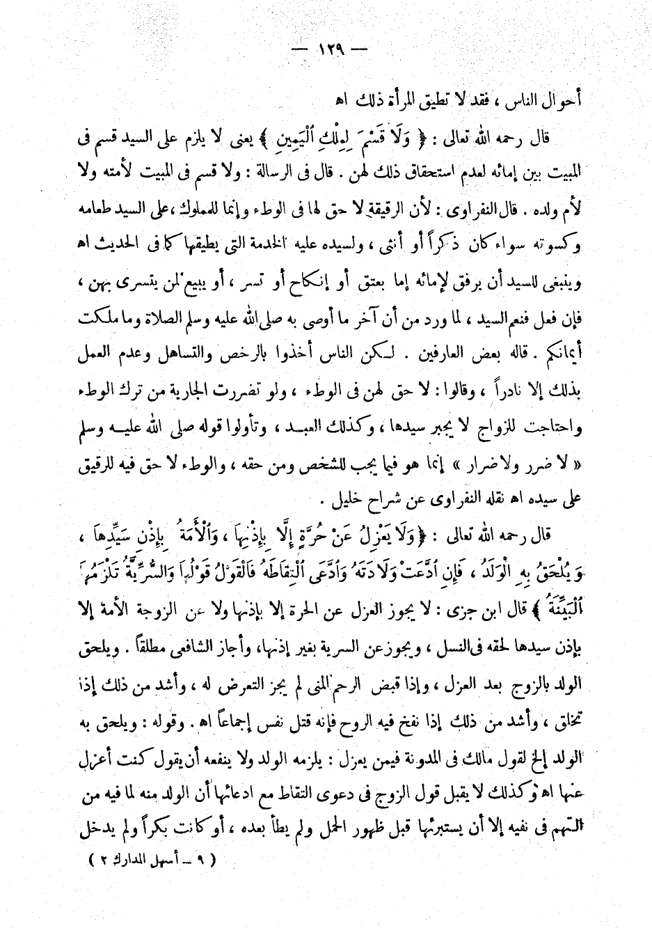 قال رحمه الله تعالى: " ولا قسم لملك اليمين " يعني لا يلزم على السيد قسم في المبيت بين إمائه لعدم استحقاق ذلك لهن. قال في الرسالة: ولا قسم في المبيت لأمته ولا لأم ولده. قال النفراوي: لأن الرقيقة لا حق لها في الوطء وإنما للمملوك، على السيد طعامه وكسوته سواء كان ذكراً أو أنثى، ولسيده عليه الخدمة التي يطيقها كما في الحديث اهـ وينبغي للسيد أن يرفق لإمائه إما بعتق أو إنكاح أو تسر، أو يبيع لمن يتسرى بهن، فإن فعل فنعم السيد، لما ورد من أن آخر ما أوصى به صلى الله عليه وسلم الصلاة وما ملكت أيمانكم. قال بعض العارفين. لكن الناس أخذوا بالرخص والتساهل وعدم العمل بذلك إلا نادراً، وقالوا: لا حق لهن في الوطء، ولو تضررت الجارية من ترك الوطء واحتاجت للزواج لا يجبر سيدها، وكذلك العبد، وتأولوا قوله صلى الله عليه وسلم: " لا ضرر ولا ضرار " إنما هو فيما يجب للشخص ومن حقه، والوطء لا حق فيه للرقيق على سيده اهـ نقله النفراوي عن شراح خليل.